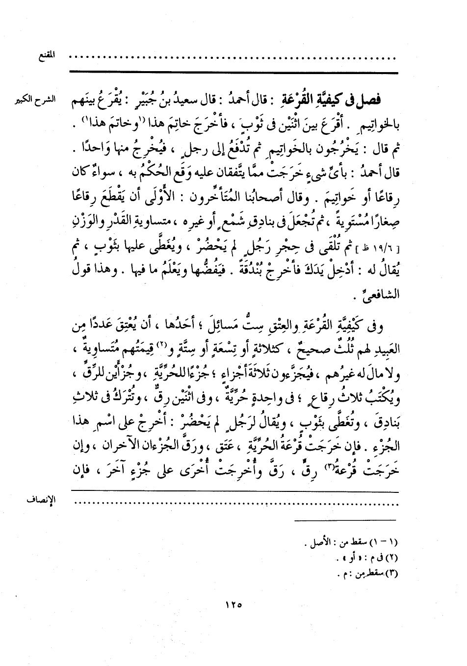 وفي كَيفِيَّةِ القُرْعَةِ والعِتْقِ سِتُّ مَسائِلَ؛ أحَدُها، أن يُعْتِقَ عَددًا من العَبِيدِ لهم ثُلُثٌ صحيحٌ، كثلاثةٍ أو تِسْعَةٍ أو سِتَّةٍ و (¬2) قِيمَتُهم مُتَساويةٌ، ولا مال له غيرُهم، فيُجَزَّءون ثَلاثَةَ أجْزاءٍ؛ جُزْءًا للحُرِّيَّةِ، وجُزْأَين للرِّقِّ، ويُكْتَبُ ثلاثُ رِقاعٍ؛ في واحِدةٍ حُرِّيَّةٌ، وفي اثْنَين رِقٌّ، وتُتْرَكُ في ثلاثِ بَنادِقَ، وتُغَطَّى بثَوْبٍ، ويُقالُ لرَجُلٍ لم يَحْضُرْ: أخْرِجْ على اسْمِ هذا الجُزْءِ. فإن خرَجَتْ قُرْعَةُ الحُرِّيَّةِ، عَتَق، ورَقَّ الجُزْءان الآخران، وإن خَرَجَتْ قُرْعةُ (¬3) رِقٍّ، رَقَّ وأُخْرِجَتْ أُخْرَى على جُزْءٍ آخَرَ، فإن