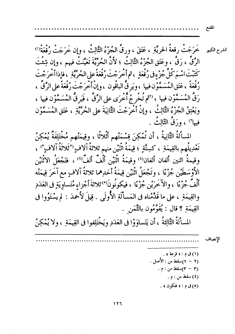 المسألةُ الثَّانِيةُ، أن تُمْكِنَ قِسْمَتُهم أثْلاثًا، وقِيمَتُهم مُخْتَلِفَةٌ يُمْكِنُ تَعْدِيلُهم بالقِيمَةِ، كسِتَّةٍ؛ قِيمَةُ اثْنَين منهم ثلاثةُ آلافٍ [ثَلاثَةُ آلافٍ] (¬3)، وقيمةُ اثنين ألفان ألفان (¬4) وقيمَةُ اثْنَين ألْفٌ ألفٌ (4)، فتجْعَلُ الاثْنَين الأوْسَطَين جُزْءًا، وتَجْعَلُ اثْنَين قِيمَةُ أحَدِهما ثلاثةُ آلافٍ مع آخَرَ قِيمَتُه ألْفٌ جُزْءًا، والآخَرَين جُزْءًا، فيكونُونَ (¬5) ثلاثةَ أجْزاءٍ مُتَساويَةٍ في العَدَدِ والقِيمَةِ، على ما قَدَّمْناه في المَسأَلةِ الأُولَى. قِيلَ لأحمدَ: لم يسْتَوُوا في القِيمَةِ؟ قال: يُقَوَّمُون بالثَّمَنِ.