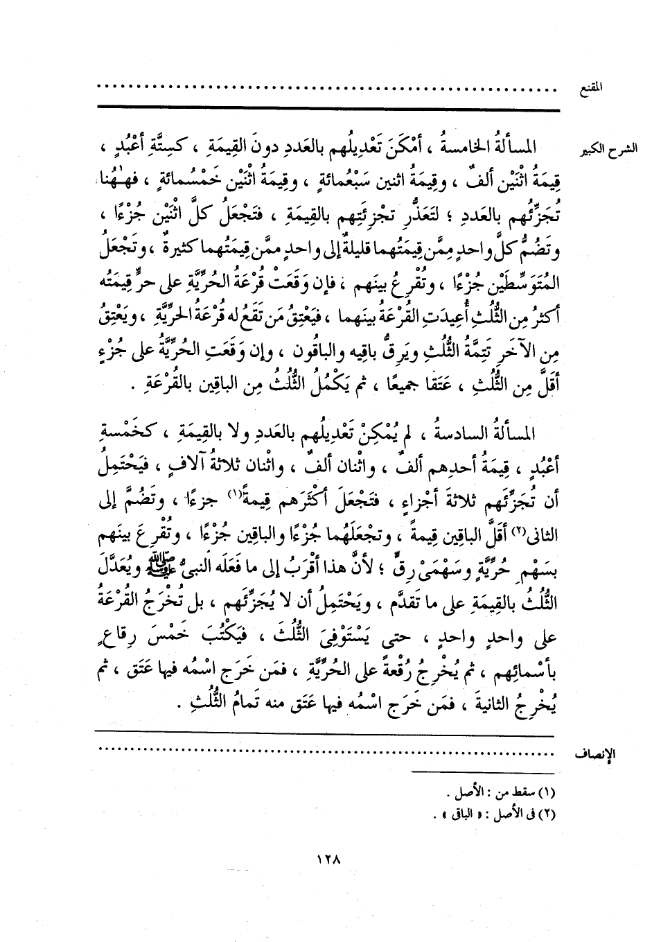 المسألةُ السادسةُ، لم يُمْكِنْ تَعْدِيلُهم بالعَددِ ولا بالقِيمَةِ، كخَمْسةِ أعْبُدٍ، قِيمَةُ أحدِ هم ألفٌ، واثْنان ألفٌ، واثْنان ثلاثةُ آلافً، فيَحْتَمِلُ أن تُجَزِّئَهم ثلاثةَ أجْزاءٍ، فتَجْعَلَ أكْثَرَهم قِيمةً (¬1) جزءًا، وتَضُمَّ إلى الثاني (¬2) أقَلَّ الباقِين قِيمةً، وتجْعَلَهُما جُزْءًا والباقِين جُزْءًا، وتُقْرِعَ بينَهم بسَهْمِ حُرِّيَّةٍ وسهْمَيْ رِقٍّ؛ لأنَّ هذا أقْرَبُ إلى ما فَعَلَه النبيُّ - صلى الله عليه وسلم - ويُعَدَّلَ الثُّلُثُ بالقِيمَةِ على ما تَقدَّم، ويَحْتَمِلُ أن لا يُجَزِّئَهم، بل تُخْرَجُ القُرْعَةُ على واحدٍ واحدٍ، حتى يَسْتَوْفِيَ الثُّلُثَ، فيَكْتُبَ خَمْسَ رِقاعٍ بأسْمائِهم، ثم يُخْرِجُ رُقْعة على الحُرِّيَّةِ، فمَن خَرَج اسْمُه فيها عَتَق، ثم يُخْرِجُ الثانيةَ، فمَن خرَج اسْمُه فيها عَتَق منه تَمامُ الثُّلُثِ.