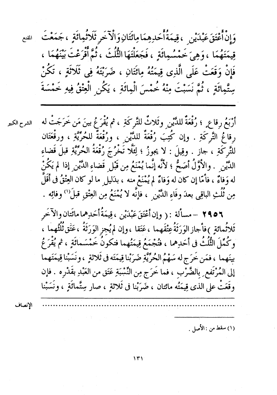 وَإنْ أعتَقَ عَبْدَينِ، قِيمَةُ أحدِهِمَا مِائَتَانِ وَالْآخَرِ ثَلَاثُمِائَةٍ، جَمَعْتَ قِيمَتَهُمَا، وَهِيَ خَمْسُمِائَةٍ، فَجَعَلْتَهَا الثُّلُثَ، ثُمَّ أَقرَعْتَ بَينَهُمَا، فَإِنْ وَقَعَتْ عَلَى الَّذِي قِيمَتُهُ مِائَتَانِ، ضَرَبْتَهُ في ثَلَاثَةٍ، تَكُنْ سِتَّمِائَةٍ، ثُمَّ نَسَبْتَ مِنْهُ خُمْسَ الْمِائَةِ، يَكُنِ الْعِتْقُ فِيهِ خَمْسَةَ
