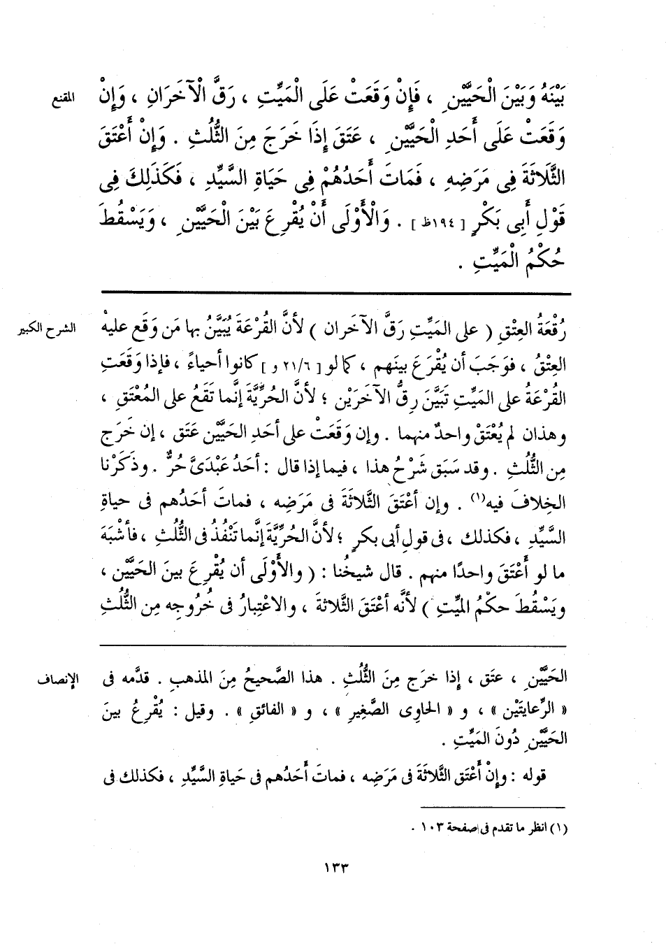 بَينَهُ وَبَينَ الْحَيَّينِ، فَإِنْ وَقَعَتْ عَلَى الْمَيِّتِ، رَقَّ الْآخَرَانِ، وَإِنْ وَقَعَتْ عَلَى أَحدِ الْحَيَّينِ، عَتَقَ إِذَا خَرَجَ مِنَ الثُّلُثِ. وإنْ أَعْتَقَ الثَّلَاثَةَ في مَرَضِهِ، فَمَاتَ أحَدُهُمْ في حَيَاةِ السَّيِّدِ، فَكَذَلِكَ في قَوْلِ أَبي بَكْر. وَالْأوْلَى أَنْ يُقْرِعَ بَينَ الْحَيَّينِ، وَيَسْقُطَ حُكْمُ الْمَيِّتِ.