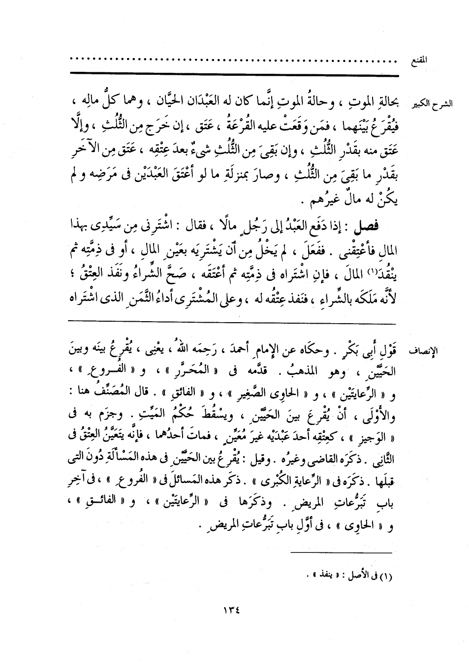 قَوْلِ أبِي بَكْرٍ. وحكَاه عن الإمامِ أحمدَ، رَحِمَه اللهُ، يعْنِي، يُقْرِعُ بينَه وبينَ الحَيَّينِ، وهو المذهبُ. قدَّمه في «المُحَرَّرِ»، و «الفُروعِ»، و «الرِّعايتَين»، و «الحاوي الصَّغِيرِ»، و «الفائقِ». قال المُصَنفُ هنا: والأوْلَى، أنْ يُقْرِعَ بينَ الحَيَّينِ، ويسْقُطَ حُكْمُ المَيِّتِ. وجزَم به في «الوَجيزِ»، كعِتْقِه أحدَ عَبْدَيه غيرَ مُعَيِّن، فماتَ أحدُهما، فإنه يتَعَيَّنُ العِتْقُ في الثَّاني. ذكَرَه القاضي وغيرُه. وقيل: يُقْرِعُ بين الحَيَّينِ في هذه المَسْألةِ دُونَ التي قبلَها. ذكَرَه في «الرِّعايةِ الكُبْرى». ذكَر هذه المَسائلَ في «الفُروعَ»، في آخِرِ بابِ تَبَرُّعاتِ المريضِ. وذكَرَها في «الرِّعايتَين»، و «الفائقِ»، و «الحاوي»، في أولِ بابِ تَبَرُّعاتِ المريضَ.