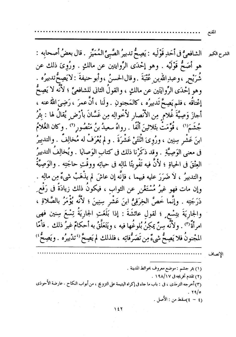 الشافعيُّ في أحَدِ قَوْلَيه: يَصِحُّ تدبيرُ الصَّبِيِّ المُمَيِّزِ. قال بعضُ أصحابِه: هو أصَحُّ قَوْلَيه. وهو إحْدَى الرِّوايتين عن مالكٍ. ورُوِيَ ذلك عن شرَيحٍ، وعبدِ الله بِنِ عُتْبَةَ. وقال الحسنُ، وأبو حنيفةَ: لا يَصِحُّ تدبيرُه. وهو إحْدَى الرِّوايَتَين عن مالكٍ، والقولُ الثاني للشافعيِّ؛ لأنَّه لا يَصِحُّ إعْتاقُه، فلم يَصِحَّ تَدبيرُه، كالمَجنونِ. ولَنا، أنَّ عمرَ، رَضِيَ اللهُ عنه، أجازَ وَصِيَّةَ غُلامٍ مِن الأنْصارِ لأخْوالِه مِن غَسَّانَ بأرْض يُقالُ لها: بِئْرُ جُشَمَ (¬1)، قُوِّمَتْ بثَلاثينَ ألْفًا. رواهُ سعيدُ بنُ مَنْصُورٍ (¬2). وكان الغُلامُ ابنَ عَشْرِ سِنِين، ورُوِيَ اثْنَتَيْ عَشْرَةَ. ولم يُعْرَفْ له مُخالِفٌ. والتدبِيرُ في معنى الوَصِيَّةِ. وقد ذكَرْنا ذلك في كتابِ الوَصايا. ويُخالِفُ التدبيرُ العِتْقَ في الحياةِ؛ لأنَّ فيه تَفْويتًا لمالِه في حياتِه ووقْتِ حاجَتِه. والوَصِيَّة والتدبيرُ، لَا ضَرَرَ عليه فيهما، فإنَّه إن عاش لم يذْهَبْ شيءٌ مِن مالِه. وإن مات فهو غيرُ مُسْتَغْنٍ عن الثوابِ، فيكونُ ذلك زيادَةً في رَفْعِ دَرَجَتِه. وإنَّما خَصَّ الخِرَقِيُّ ابنَ عَشْرِ سِنِينَ؛ لأنَّه يُؤْمَرُ بالصَّلاةِ، والجارِيَةَ بتِسْعٍ؛ لقولِ عائشَةَ: إذا بَلَغَتِ الجارِيَةُ تِسْعَ سِنين فهي امرأةٌ (¬3). ولأنَّه سِنٌّ يمكِنُ بُلوغُها فيه، ويَتَعَلَّقُ به أحكامٌ غيرُ ذلك. فأمّا المجْنونُ فلا يَصِحُّ شيءٌ مِن تَصَرُّفاتِه، فلذلك لم يَصِحَّ [تدْبيرُه. ويَصِحُّ] (¬4)