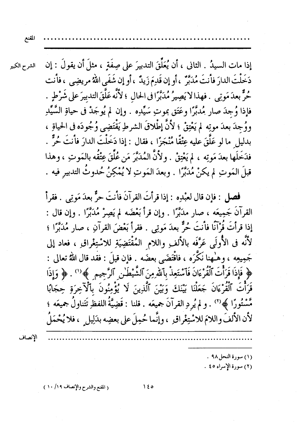 فصل: فإن قال لعبْدِه: إذا قرأتَ القرآنَ فأنتَ حر بعدَ مَوتِي. فقرأ القرآنَ جَمِيعَه، صار مدَبَّرًا. وإن قرأ بَعْضَه لم يَصِرْ مُدَبَّرًا. وإن قال: إذا قرأتَ قُرْآنًا فأنتَ حُرٌّ بعدَ مَوتِي. فقرأ بَعْضَ القرآنِ، صار مُدَبَّرًا؛ لأنَّه في الأُولَى عَرَّفَه بالألفِ واللامِ المُقْتَضِيَةِ للاسْتغْراقِ، فعاد إلى جَمِيعِه، وههنا نَكَّرَه، فاقْتَضَى بعضَه. فإن قيلَ: فقد قال الله تعالى: {فَإِذَا قَرَأْتَ الْقُرْآنَ فَاسْتَعِذْ بِاللَّهِ مِنَ الشَّيطَانِ الرَّجِيمِ} (¬1). {وَإِذَا قَرَأْتَ الْقُرْآنَ جَعَلْنَا بَينَكَ وَبَينَ الَّذِينَ لَا يُؤْمِنُونَ بِالْآخِرَةِ حِجَابًا مَسْتُورًا} (¬2). ولم يُرِدِ القرآنَ جميعَه. قلنا: قَضِيَّةُ اللفظِ تَتَناولُ جميعَه؛ لأن الألفَ واللامَ للاسْتِغْراقِ، وإنَّما حُمِلَ على بعضِه بدَلِيل، فلا يُحْمَلُ