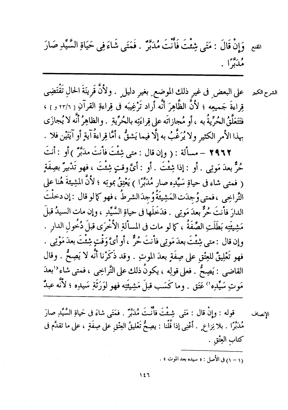 قوله: وإنْ قال: مَتَى شِئْتَ فأنْتَ مُدَبَّر. فمَتَى شاءَ في حَياةِ السَّيِّدِ صارَ مُدَبَّرًا. بلا نِزاع. أعْنِي إذا قُلْنا: يصِحُّ تَعْليقُ العِتْقِ على صِفَةٍ، على ما تقدَّم في كتابِ العِتْقِ.