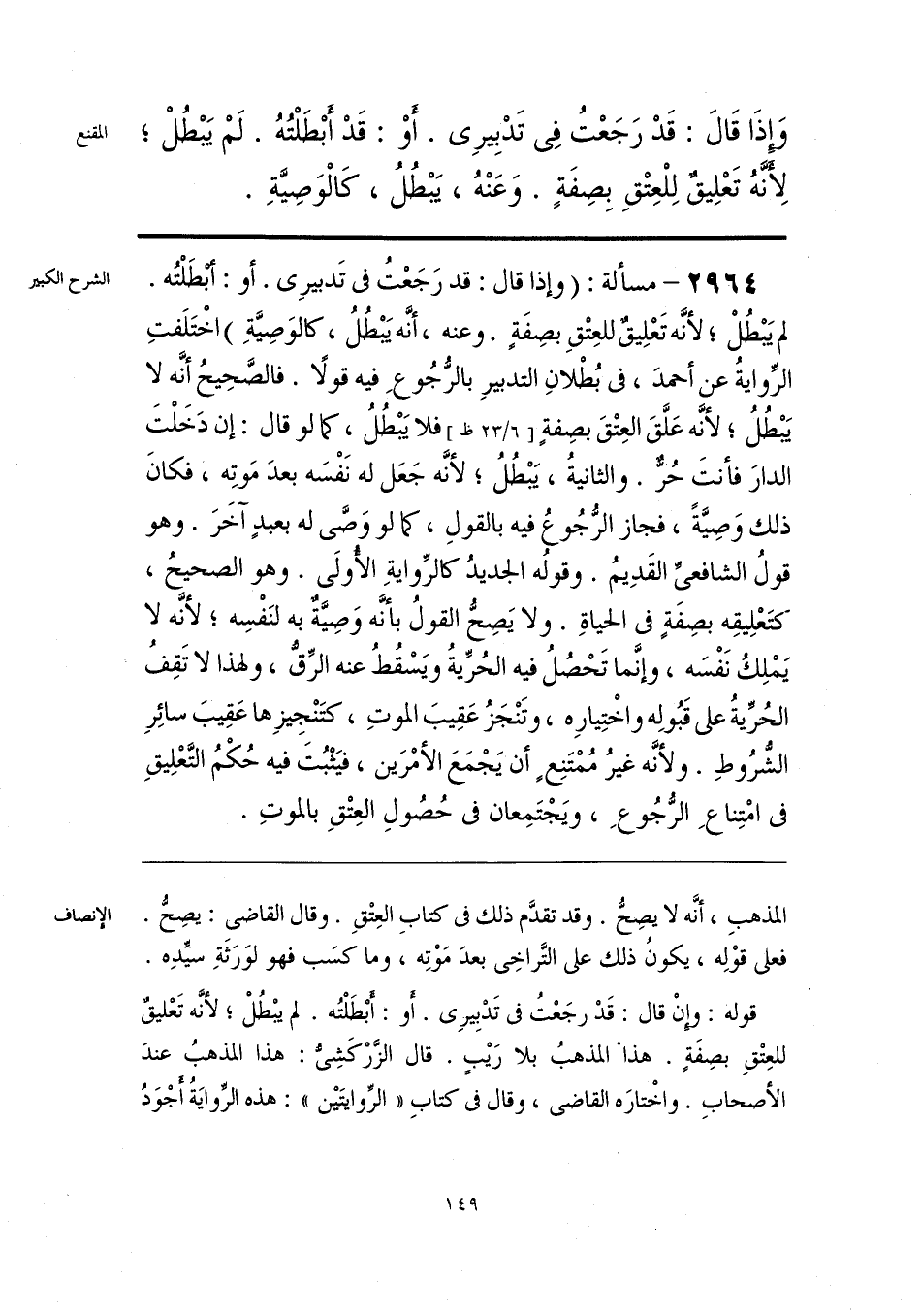 قوله: وإنْ قال: قَدْ رجَعْتُ في تَدْبِيرِي. أو: أبْطَلْتُه. لم يبْطُلْ؛ لأنَّه تَعْليقٌ للعِتْقِ بصِفَةٍ. هذا المذهبُ بلا رَيبٍ. قال الزَّرْكَشِيُّ: هذا المذهبُ عندَ الأصحابِ. واخْتارَه القاضي، وقال في كتابِ «الرِّوايتَين»: هذه الرِّوايَةُ أَجْوَدُ