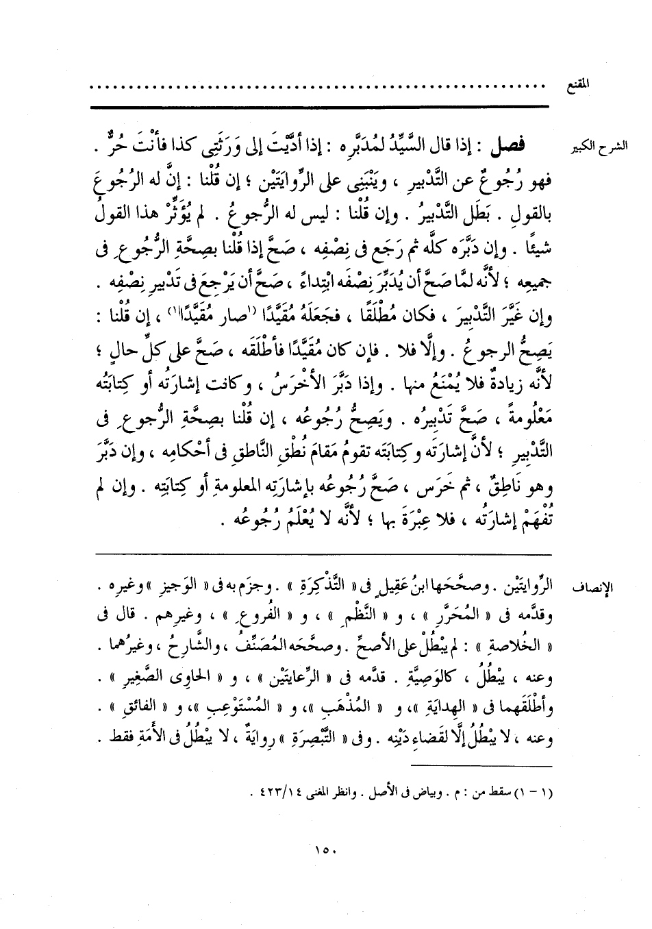 الرِّوايتَين. وصحَّحَها ابنُ عَقِيلٍ في «التَّذْكِرَةِ». وجزَم به في «الوَجيزِ» وغيرِه. وقدَّمه في «المُحَرَّرِ»، و «النَّظْمِ»، و «الفُروعِ»، وغيرِهم. قال في «الخُلاصةِ»: لم يبْطُلْ على الأصحِّ. وصحَّحَه المُصَنِّفُ، والشَّارِحُ، وغيرُهما. وعنه، يبْطُلُ، كالوَصِيَّةِ. قدَّمه في «الرِّعايتَين»، و «الحاوي الصَّغِيرِ». وأطْلَقَهما في «الهِدايَةِ»، و «المُذْهَبِ»، و «المُسْتَوْعِبِ»، و «الفائقِ». وعنه، لا يبْطُلُ إلَّا لقَضاءِ دَينِه. وفي «التَّبْصِرَةِ» رِوايَةٌ، لا يبْطُلُ في الأمَةِ فقط.