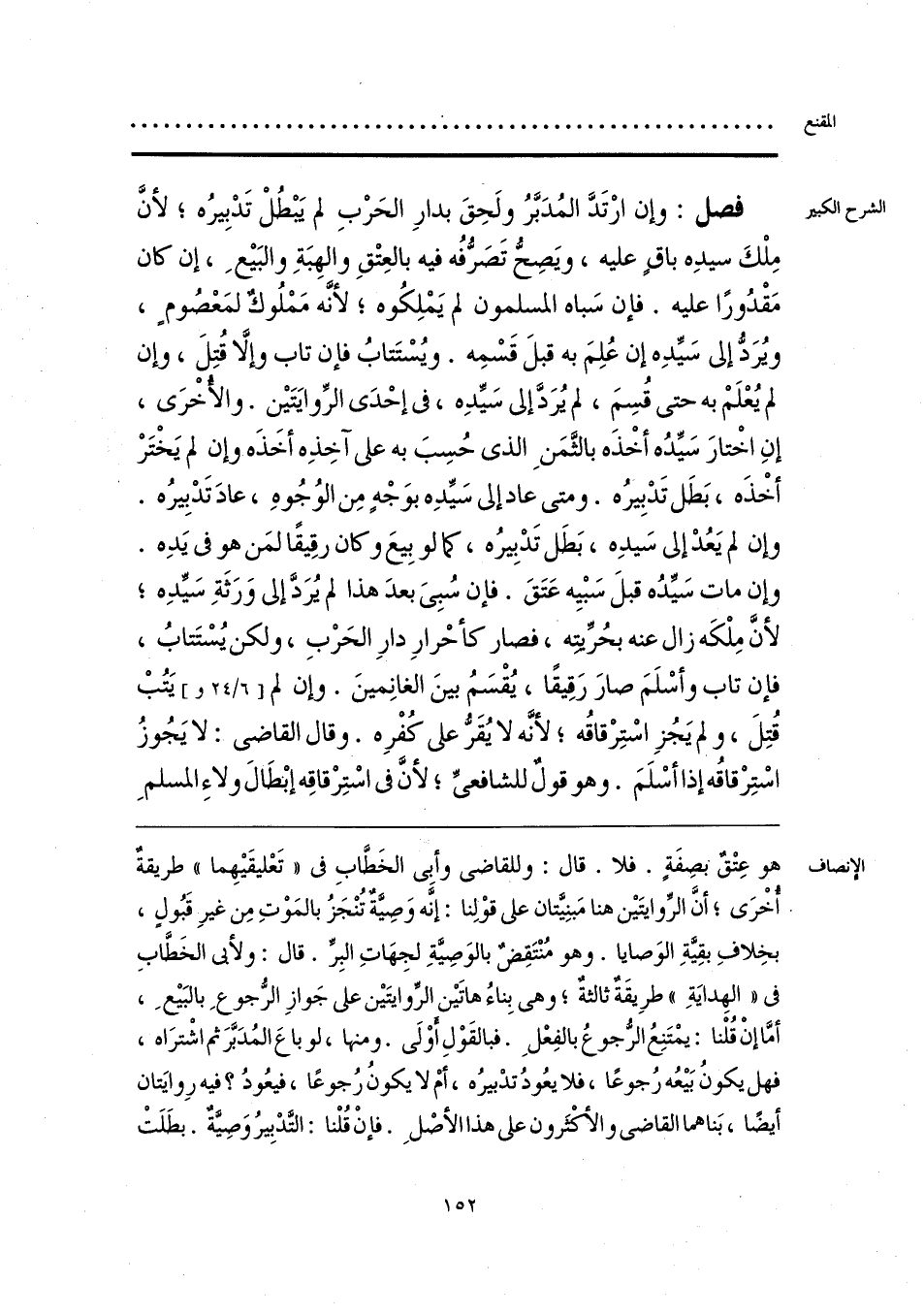 هو عِتْقٌ بصِفَةٍ. فلا. قال: وللقاضى وأبي الخَطَّابِ في «تَعْليقَيهِما» طريقةٌ أُخْرَى؛ أنَّ الرِّوايتَين هنا مَبنِيَّتان على قوْلِنا: إنَّه وَصِيَّةٌ تُنْجَزُ بالمَوْتِ مِن غيرِ قَبُولٍ، بخِلافِ بقِيَّةِ الوَصايا. وهو مُنتَقِضٌ بالوَصِيَّةِ لجِهَاتِ البِرِّ. قال: ولأبي الخَطَّابِ في «الهِدايَةِ» طرِيقَةٌ ثالثةٌ؛ وهي بِناءُ هاتَين الرِّوايتَين على جَوازِ الرُّجوعِ بالبَيعِ، أمَّا إنْ قُلْنا: يمْتَنِعُ الرُّجوعُ بالفِعْلِ. فبالقَوْلِ أَوْلَى. ومنها، لو باعَ المُدَبَّرَ ثم اشْترَاه، فهل يكونُ بَيعُه رُجوعًا، فلا يعُودُ تدْبيرُه، أمْ لا يكونُ رُجوعًا، فيعُودُ؟ فيه رِوايَتان أيضًا، بَناهما القاضي والأكْثَرون على هذا الأصْلِ. فإنْ قُلْنا: التَّدْبِيرُ وَصِيَّةٌ. بطَلَتْ