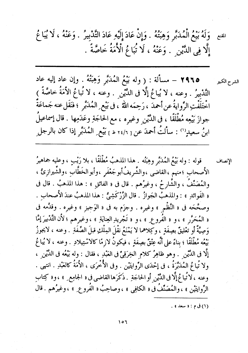 قوله: وله بَيعُ المُدَبَّرِ وهِبَتُه. هذا المذهبُ مُطْلَقًا، بلا رَيبٍ، وعليه جماهيرُ الأصحابِ؛ منهم، القاضي، والشَّرِيفُ أبو جَعْفَرٍ، وأبو الخَطَّابِ، والشِّيرازِيُّ، والمُصَنِّفُ، والشَّارِحُ، وغيرُهم. قال في «الفائقِ»: هذا المذهبُ. قال في «الفَوائدِ»: والمذهبُ الجَوازُ. قال الزَّرْكَشِيُّ: هذا المذهبُ عندَ الأصحابِ. وصحَّحَه في «النَّظْمِ» وغيرِه. وجزَم به في «الوَجِيزِ» وغيرِه. وقدَّمه في «المُحَرَّرِ»، و «الفُروعِ»، و «تَجْريدِ العِنايَةِ»، وغيرِهم؛ لأن التَّدْبيرَ إمَّا وَصِيَّةٌ أو تعْليق بصِفَةٍ، وكِلاهما لا يَمْنَعُ نقْلَ المِلْكِ قبلَ الصِّفَةِ. وعنه، لايجوزُ بَيعُه مُطْلَقًا؛ بِناءً على أنَّه عِتْقٌ بصِفَةٍ، فيكونُ لازِمًا كالاسْتِيلادِ. وعنه، لا يُباعُ إلَّا في الدَّينِ. وهو ظاهِرُ كلامِ الخِرَقِيِّ في العَبْدِ، فقال: وله بَيعُه في الدَّينِ، ولا تُباعُ المُدَبَّرَةُ، في إحْدَى الرِّوايتَين. وفي الأخْرَى، الأمَةُ كالعَبْدِ. انتهى. وعنه، لا تُباعُ إلَّا في الدَّينِ أو الحاجَةِ. ذَكَرَها القاضي في «الجامِعِ»، و «كِتابِ الرِّوايتَين»، والمُصَنِّفُ في «الكافِي»، وصاحِبُ «الفُروعِ»، وغيرُهم. قال