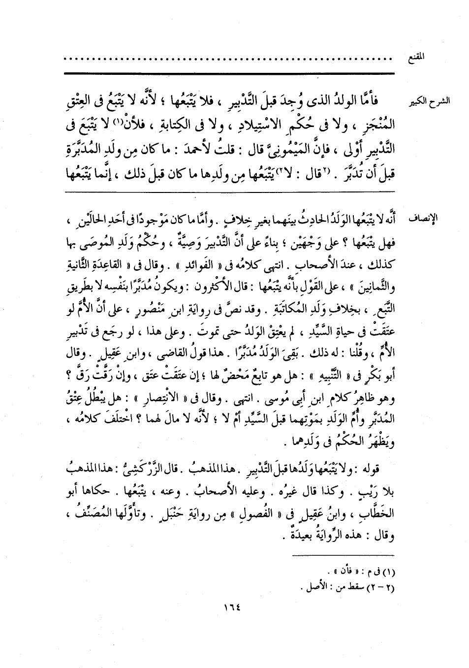 أنَّه لا يتْبَعُها الوَلَدُ الحادِثُ بينَهما بغيرِ خِلافٍ. وأمَّا ما كان مَوْجودًا في أحَدِ الحالينِ، فهل يتْبَعُها؟ على وَجْهَين؛ بِناءً على أنَّ التَّدْبيرَ وَصِيَّةٌ، وحُكْمُ وَلَدِ المُوصَى بها كذلك، عندَ الأصحابِ. انتهى كلامُه في «الفَوائدِ». وقال في «القاعِدَةِ الثَّانيةِ والثَّمانِينَ»، على القَوْلِ بأنَّه يتْبَعُها: قال الأكْثرون: ويكونُ مُدَبَّرًا بنَفْسِه لا بطَريقِ التَّبَعِ، بخِلافِ وَلَدِ المُكاتَبَةِ. وقد نصَّ في رِوايَةِ ابنِ مَنْصُورٍ، على أنَّ الأُمَّ لو عتَقَتْ في حياةِ السَّيِّدِ، لم يعْتِقْ الوَلدُ حتى تموتَ. وعلى هذا، لو رجَع في تَدْبيرِ الأُمِّ، وقُلْنا: له ذلك. بَقِيَ الوَلَدُ مُدَبَّرًا. هذا قولُ القاضي، وابنِ عَقِيلٍ. وقال أبو بَكْرٍ في «التَّنْبِيهِ»: هل هو تايعٌ مَحْضٌ لها؛ إن عتَقَتْ عتَق، وإنْ رَقَّتْ رَقَّ؟ وهو ظاهِرُ كلامِ ابنِ أبِي مُوسى. انتهى. وقال في «الانْتِصارِ»: هل يبْطُلُ عِتْقُ المُدَبَّرِ وأُمِّ الوَلَدِ بمَوْتِهما قبلَ السَّيِّدِ أمْ لا؛ لأنَّه لا مال لهما؟ اخْتلَفَ كلامُه، ويَظْهَرُ الحُكْمُ في وَلَدِهما.