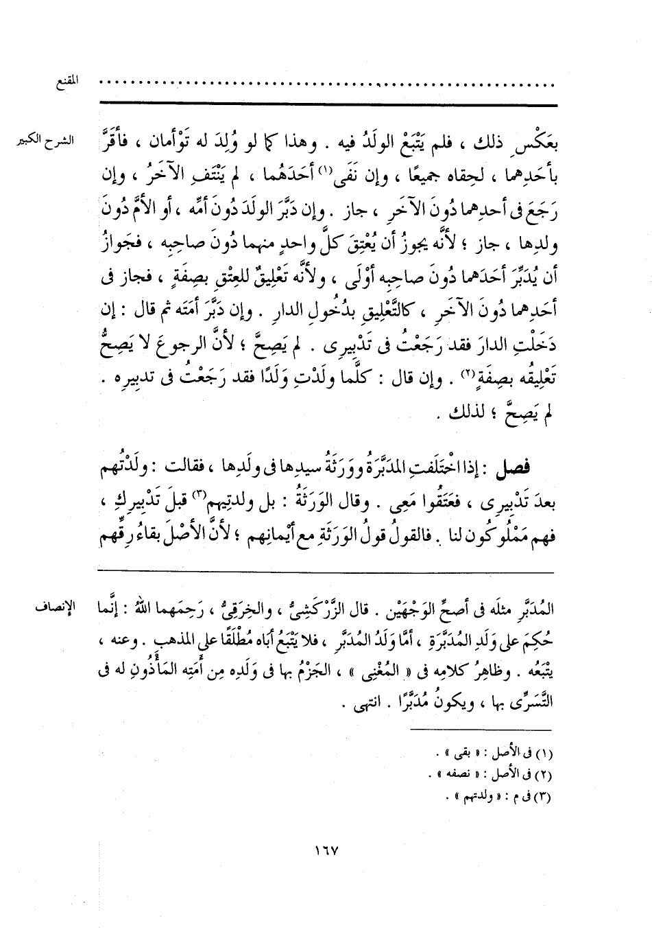 المُدَبَّرِ مثلَه في أصح الوَجْهَين. قال الزَّرْكَشِيُّ، والخِرَقِيُّ، رَحِمَهما اللهُ: إنَّما حُكِمَ على وَلَدِ المُدَبَّرَةِ، أمَّا وَلَدُ المُدَبَّرِ، فلا يَتْبَعُ أباه مُطْلَقًا على المذهب. وعنه، يتْبَعُه. وظاهِرُ كلامِه في «المُغْنِي»، الجَزْمُ بها في وَلَدِه مِن أمتِه المَأذُونِ له في التَّسَرِّي بها، ويكونُ مُدَبَّرًا. انتهى.