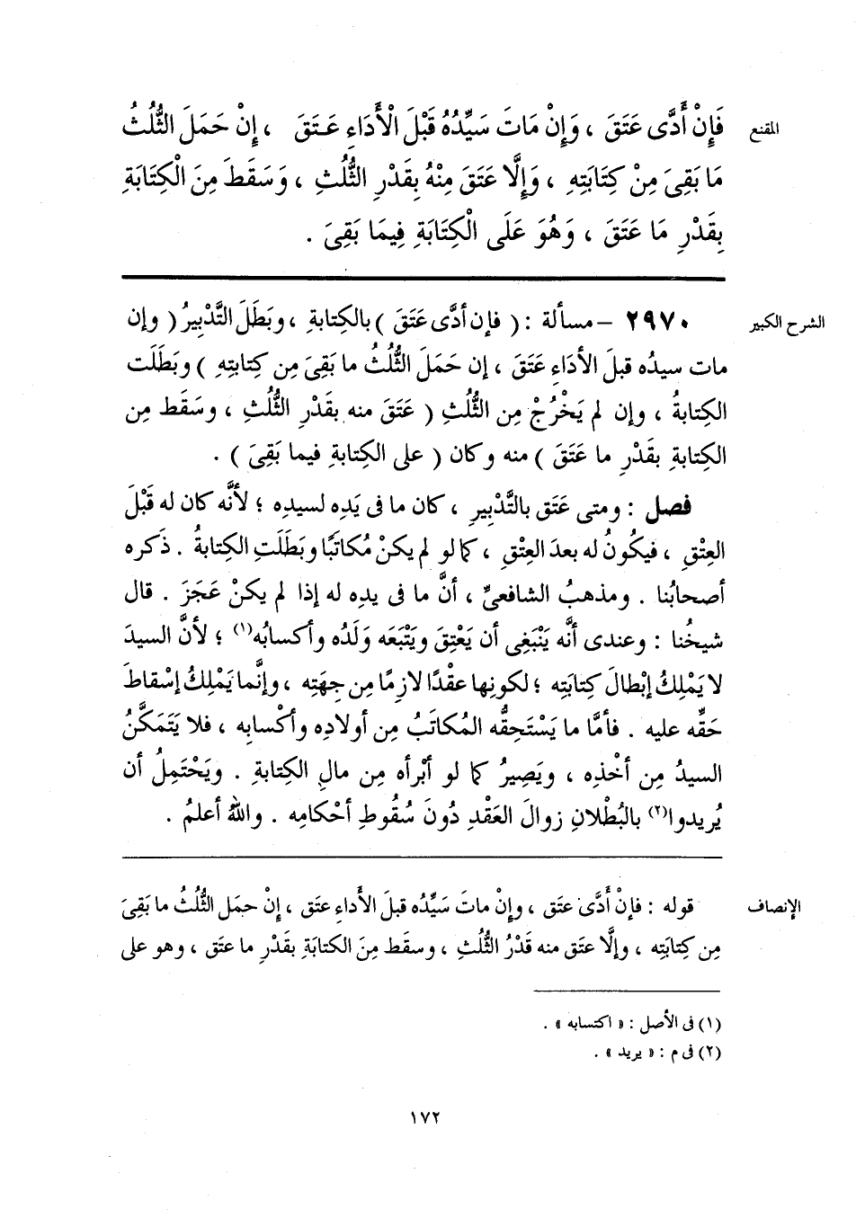 قوله: فإنْ أَدَّى عتَق، وإنْ ماتَ سَيِّدُه قبلَ الأداءِ عتَق، إِنْ حمَل الثُّلُثُ ما بَقِيَ مِن كِتابَتِه، وإلَّا عتَق منه قَدْرُ الثُّلُثِ، وسقَط مِنَ الكتابَه بقَدْرِ ما عتَق، وهو على