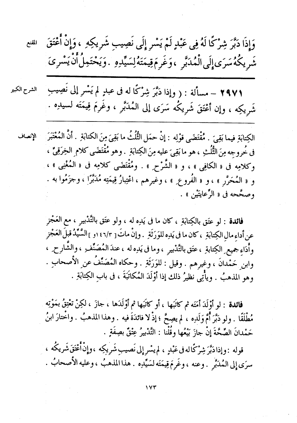 الكِتابَةِ فيما بَقِيَ. مُقْتَضَى قوْلِه: إنْ حمَل الثُّلُثُ ما بَقِيَ مِنَ الكتابَةِ. أنَّ المُعْتَبَرَ في خُروجِه مِنَ الثُّلُثِ، هو ما بَقِيَ عليه مِنَ الكِتابَةِ. وهو مُقتَضَى كلامِ الخِرَقِيِّ، وكلامِه في «الكافِي»، و «الشَّرْحِ». ومُقْتَضَى كلامِه في «المُغْنِي»، و «المُحَرَّرِ»، و «الفُروعِ»، وغيرِهم، اعْتِبارُ قِيمَتِه مُدَبَّرًا، وجزَمُوا به. وصحَّحه في «الرعايتَين».