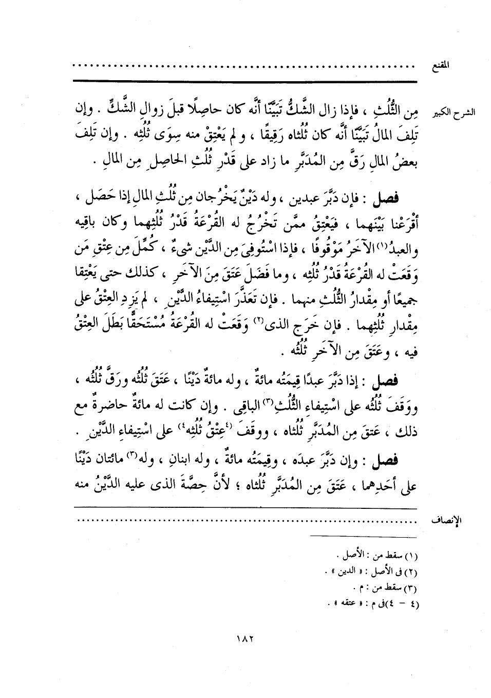 فصل: إذا دَبَّرَ عبدًا قِيمَتُه مائةٌ، وله مائةٌ دَينًا، عَتَقَ ثُلُثُه ورَقَّ ثُلُثُه، ووَقَفَ ثُلُثُه على اسْتِيفاءِ الثُّلُثِ (¬3) الباقِي. وإن كانت له مائةٌ حاضرةٌ مع ذلك، عَتقَ مِن المُدَبَّرِ ثُلُثاه، ووقَف [عِتْقُ ثُلُثِه] (¬4) على اسْتِيفاءِ الدَّينِ.