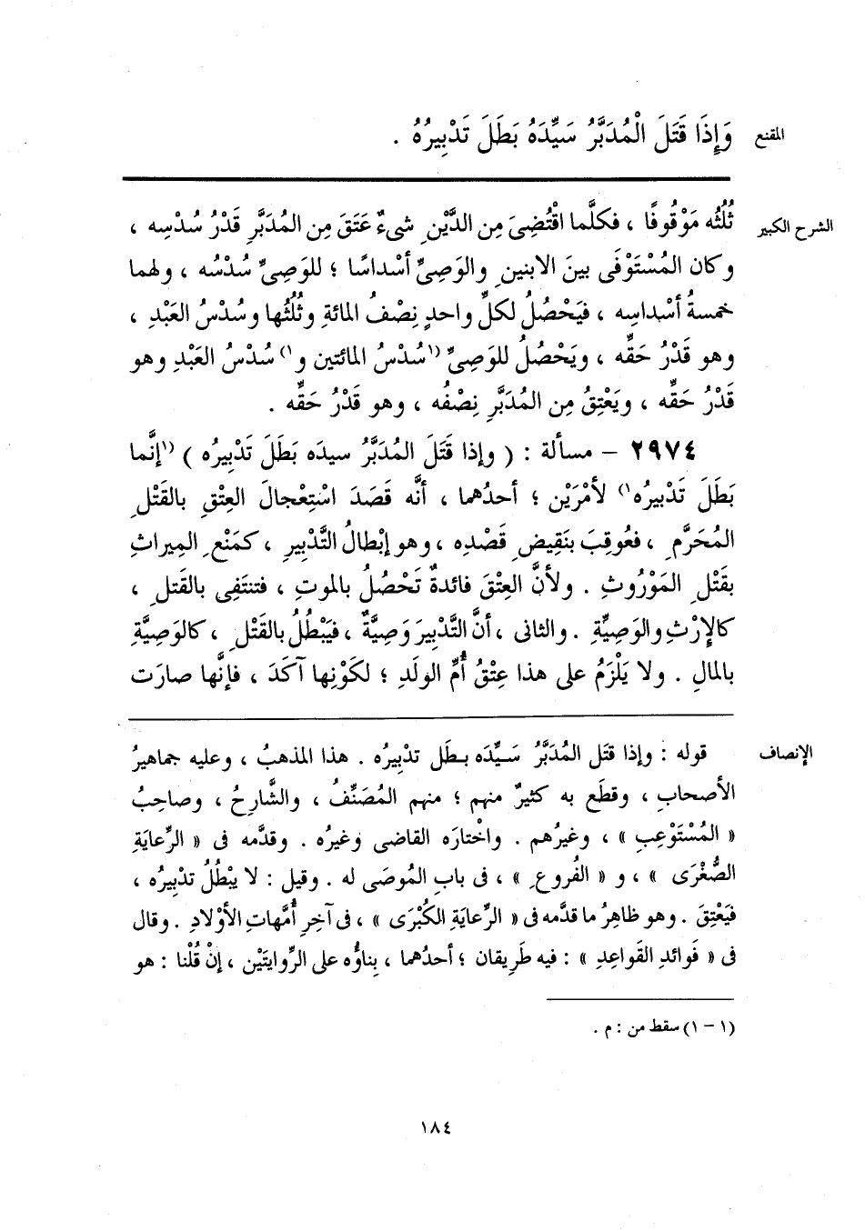قوله: وإذا قتَل المُدَبَّرُ سَيِّدَه بطَل تدْبِيرُه. هذا المذهبُ، وعليه جماهيرُ الأصحابِ، وقطَع به كثيرٌ منهم، منهم المُصَنِّفُ، والشَّارِحُ، وصاحِبُ «المُسْتَوْعِبِ»، وغيرُهم. واخْتارَه القاضي وغيرُه. وقدَّمه في «الرِّعايَةِ الصُّغْرَى»، و «الفُروعِ»، في بابِ المُوصَى له. وقيل: لا يبْطُلُ تدْبِيرُه، فيَعْتِقَ. وهو ظاهِرُ ما قدَّمه في «الرِّعايَةِ الكُبْرَى»، في آخِرِ أُمَّهاتِ الأوْلادِ. وقال في «فَوائدِ القَواعِدِ»: فيه طَرِيقان، أحدُهما، بِناؤُه على الرِّوايتَين، إنْ قُلْنا: هو