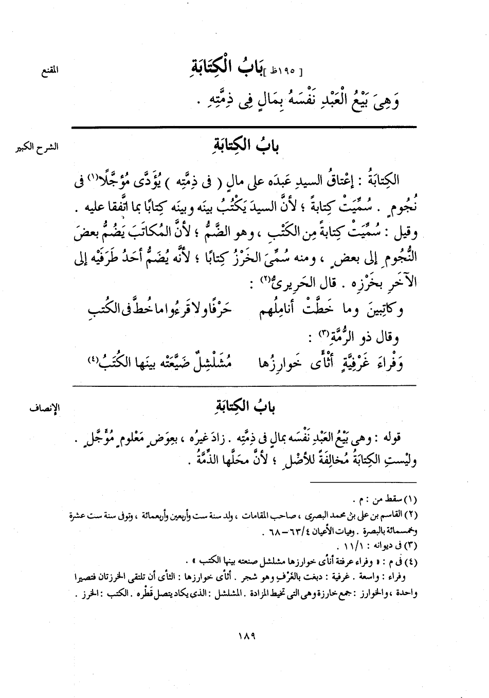 قوله: وهي بَيعُ العَبْدِ نَفْسَه بمالٍ في ذِمَّتِه. زادَ غيرُه، بعِوَضٍ مَعْلومٍ مُؤجَّلٍ. وليستِ الكِتابَةُ مُخالِفَة للأصْلِ؛ لانَّ محَلَّها الذِّمَّةُ.