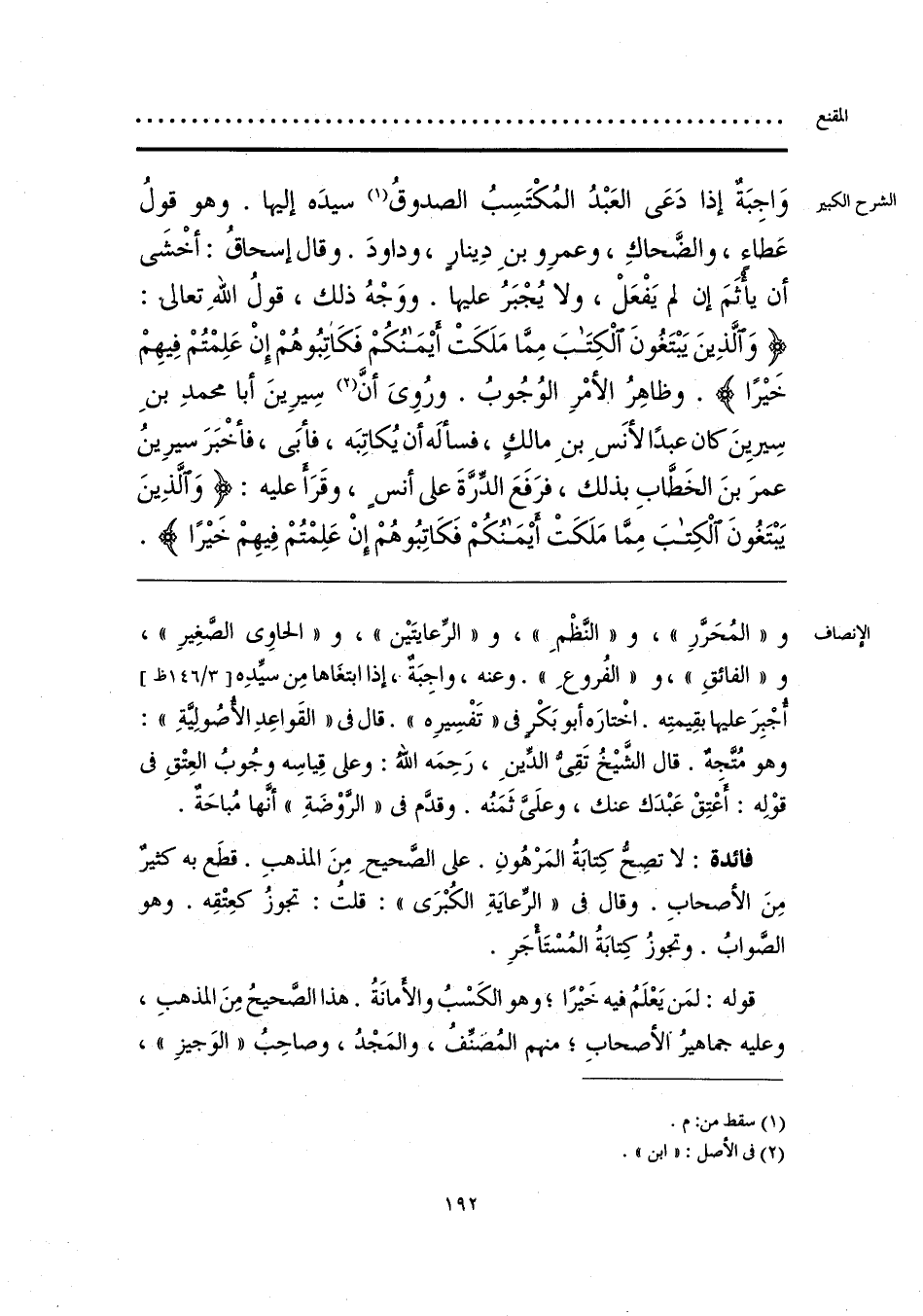 و «المُحَرَّرِ»، و «النَّظْمِ»، و «الرِّعايتَين»، و «الحاوي الصَّغِيرِ»، و «الفائقِ»، و «الفُروعِ». وعنه، واجِبَةٌ، إذا ابتغَاها مِن سيِّدِه أُجْبِرَ عليها بقِيمتِه. اخْتارَه أبو بَكْرٍ في «تَفْسِيرِه». قال في «القَواعِدِ الأصُولِيَّةِ»: وهو مُتجهٌ. قال الشَّيخُ تَقِي الدينِ، رَحِمَه اللهُ: وعلى قِياسِه وجُوبُ العِتْقِ في قوْلِه: أعتِقْ عَبْدَك عنك، وعلَيَّ ثَمَنُه. وقدَّم في «الرَّوْضَةِ» أنَّها مُباحَةٌ.