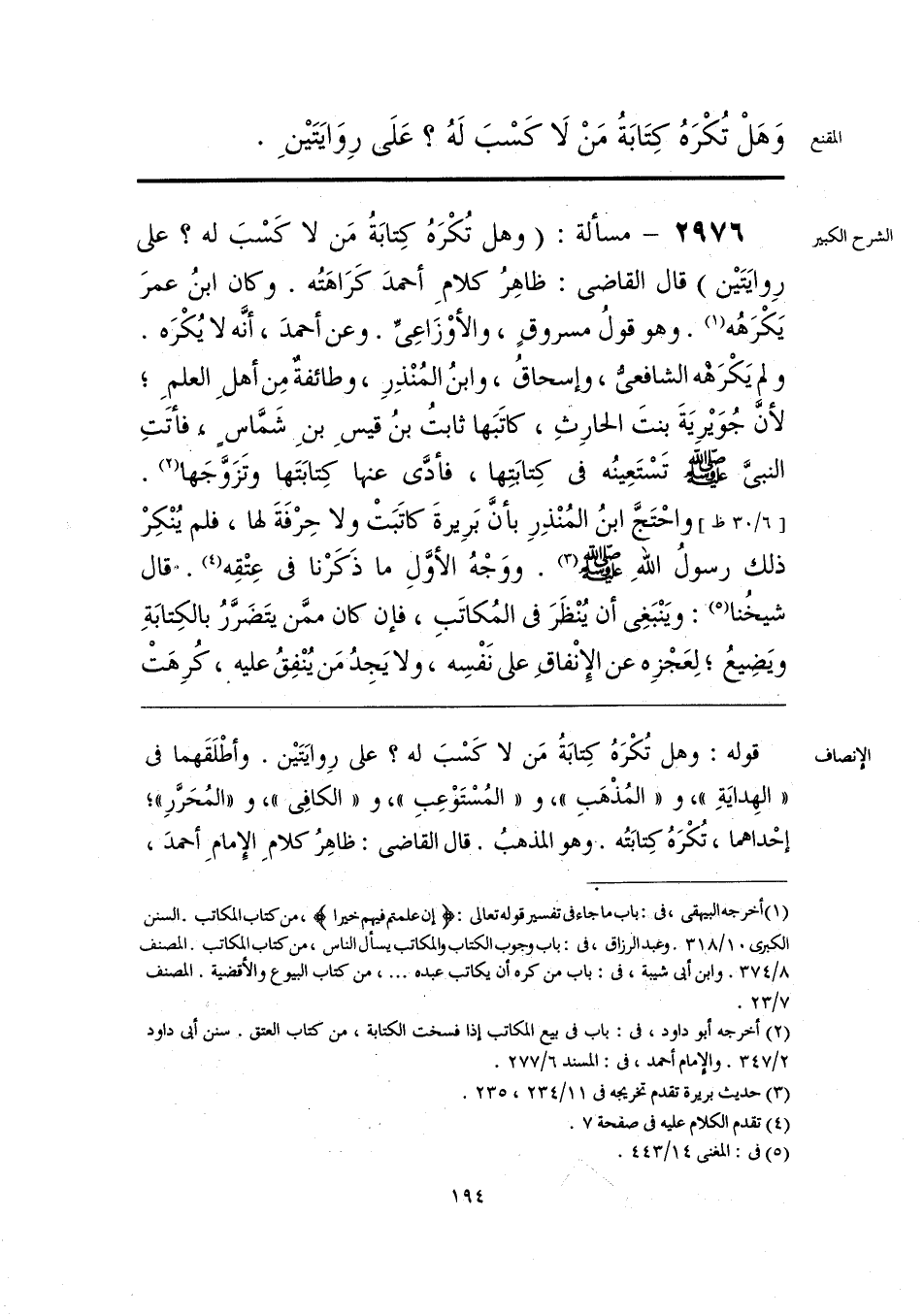 قوله: وهل تُكْرَهُ كِتابَةُ مَن لا كَسْبَ له؟ على رِوايَتَين. وأطْلَقَهما في «الهِدايَةِ»، و «المُذْهَبِ»، و «المُسْتَوْعِبِ»، و «الكافِي»، و «المُحَرَّرِ»؛ إحْداهما، تُكْرَهُ كِتابَتُه. وهو المذهبُ. قال القاضي: ظاهِرُ كلامِ الإِمامِ أحمدَ،