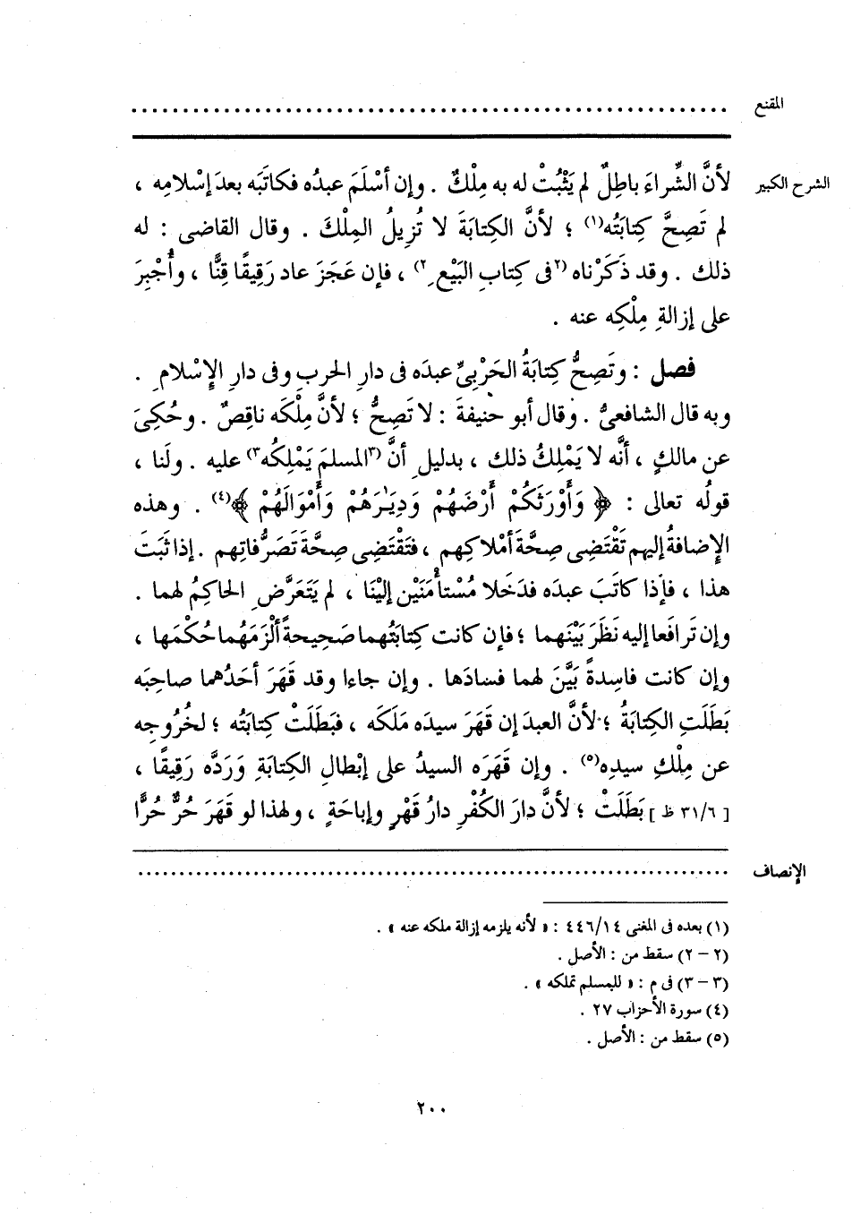 فصل: وتَصِحُّ كِتابَةُ الحَرْبِيِّ عبدَه في دارِ الحربِ وفي دارِ الإسْلامِ. وبه قال الشافعيُّ. وقال أبو حنيفةَ: لا تَصِحُّ؛ لأنَّ مِلْكَه ناقِصٌ. وحُكِيَ عن مالكٍ، أَنَّه لا يَمْلِكُ ذلك، بدليلِ أنَّ [المسلم يَمْلِكُه] (¬3) عليه. ولَنا، قولُه تعالى: {وَأَوْرَثَكُمْ أرْضَهُمْ وَدِيَارَهُمْ وأَمْوَالهُمْ} (¬4). وهذه الإضافةُ إليهم تَقْتَضِي صِحَّةَ أمْلاكِهم، فتَقْتَضِي صِحَّةَ تَصَرُّفاتِهم. إذا ثَبَتَ هذا، فإذا كاتَبَ عبدَه فدَخَلا مُسْتأْمَنَين إلينَا، لم يَتَعَرُّضِ الحاكِمُ لهما. وإن تَرافَعا إليه نَظَرَ بَينَهما؛ فإن كانت كِتابَتُهما صَحِيحةً ألْزَمَهُما حُكْمَها، وإن كانت فاسِدةً بَيّنَ لهما فسادَها. وإن جاءا وقد قَهَرَ أحَدُهما صاحِبَه بَطَلَتِ الكِتابَةُ؛ لأنَّ العبدَ إن قَهَرَ سيدَه مَلَكَه، فبَطَلَتْ كِتابَتُه؛ لخُرُوجِه عن مِلْكِ سيدِه (¬5). وإن قَهَرَه السيدُ على إبْطالِ الكِتابَةِ وَرَدَّه رَقِيقًا، بَطَلَتْ؛ لأنَّ دارَ الكُفْرِ دارُ قَهْرٍ وإباحَةٍ، ولهذا لو قَهَرَ حُرٌّ حُرًّا