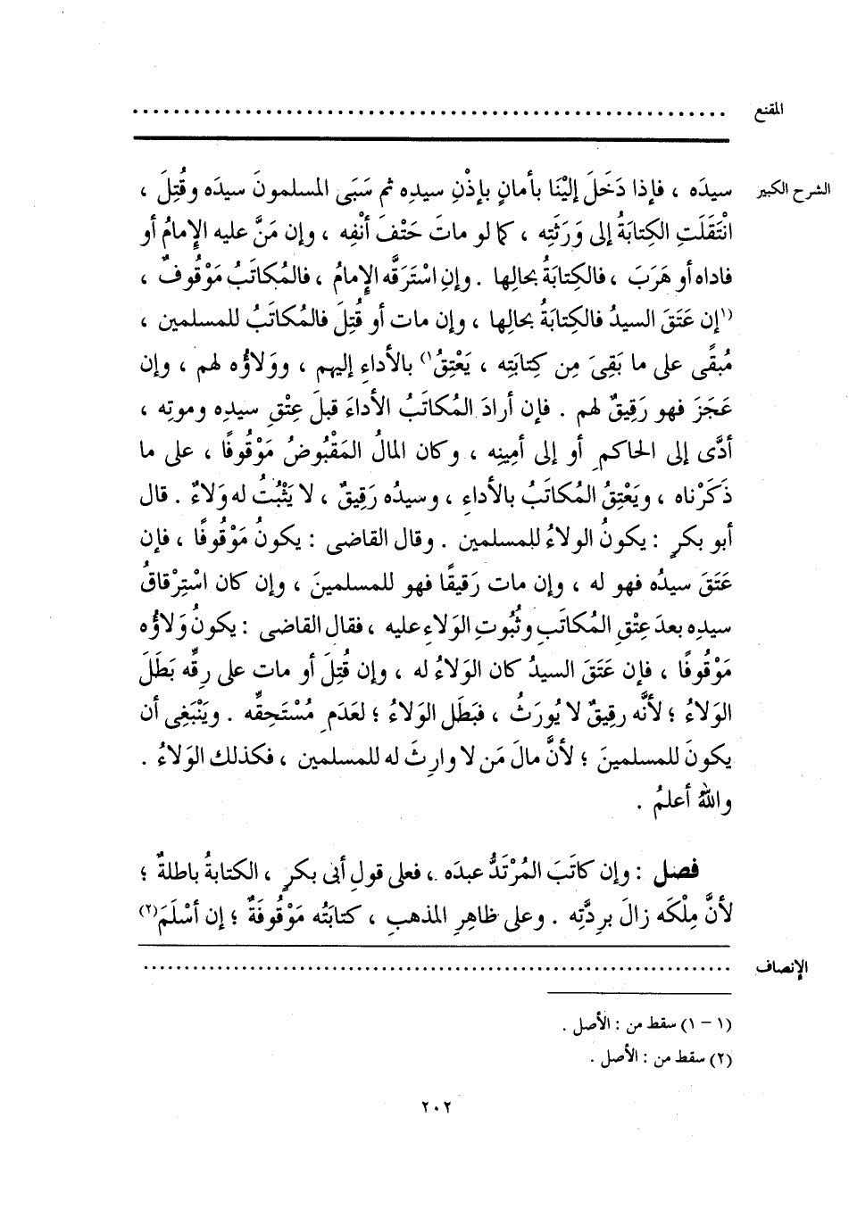 فصل: وإن كاتَبَ المُرْتَدُّ عبدَه، فعلى قولِ أبي بكرٍ، الكتابةُ باطلةٌ؛ لأنَّ مِلْكَه زال برِدَّتِه. وعلى ظاهِرِ المذهبِ، كتابَتُه مَوْقُوفَةٌ؛ إن أسْلَمَ (¬2)