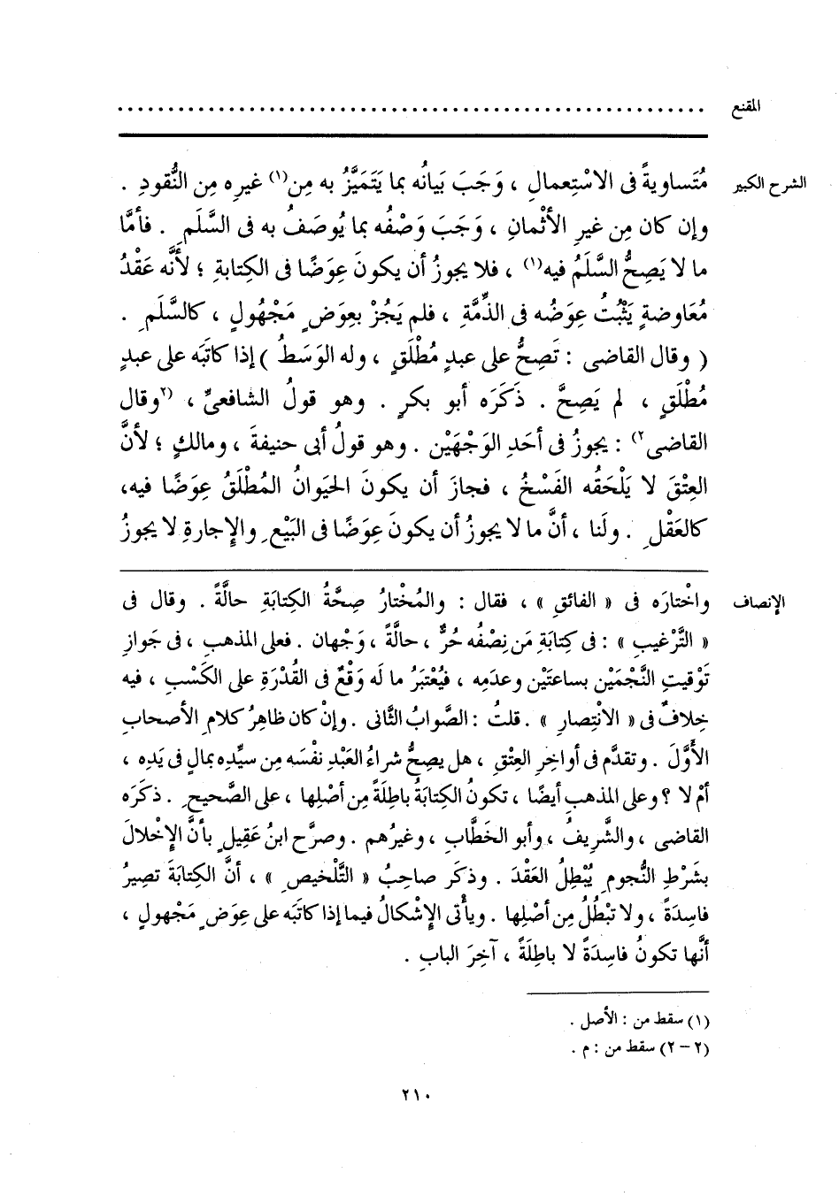 واخْتارَه في «الفائقِ»، فقال: والمُخْتارُ صِحَّةُ الكِتابَةِ حالةً. وقال في «التَّرْغيبِ»: في كِتابَةِ مَن نِصْفُه حُرٌّ، حالَّةً، وَجْهان. فعلى المذهبِ، في جَوازِ تَوْقيتِ النَّجْمَين بساعتَين وعدَمِه، فيُعْتبَرُ ما لَه وَقْعٌ في القُدْرَةِ على الكَسْبِ، فيه خِلافٌ في «الانْتِصارِ». قلتُ: الصَّوابُ الثَّاني. وإنْ كان ظاهِرُ كلامِ الأصحابِ الأوَّلَ. وتقدَّم في أواخِرِ العِتْقِ، هل يصِحُّ شراءُ العَبْدِ نفْسَه مِن سيِّدِه بمالٍ في يَدِه، أمْ لا؟ وعلى المذهبِ أيضًا، تكونُ الكِتابَةُ باطِلَةً مِن أصْلِها، على الصَّحيحِ. ذكَرَه القاضي، والشَّرِيفُ، وأبو الخَطَّابِ، وغيرُهم. وصرَّح ابنُ عَقِيلٍ بأنَّ الإِخلال بشَرْطِ النُّجومِ يُبْطِلُ العَقْدَ. وذكَر صاحِبُ «التَّلخيصِ»، أنَّ الكِتابَةَ تصِيرُ فاسِدَةً، ولا تبْطُلُ مِن أصْلِها. ويأتي الإِشْكالُ فيما إذا كاتَبَه على عِوَضٍ مَجْهولٍ، أنَّها تكونُ فاسِدَةً لا باطِلَةً، آخِرَ البابِ.