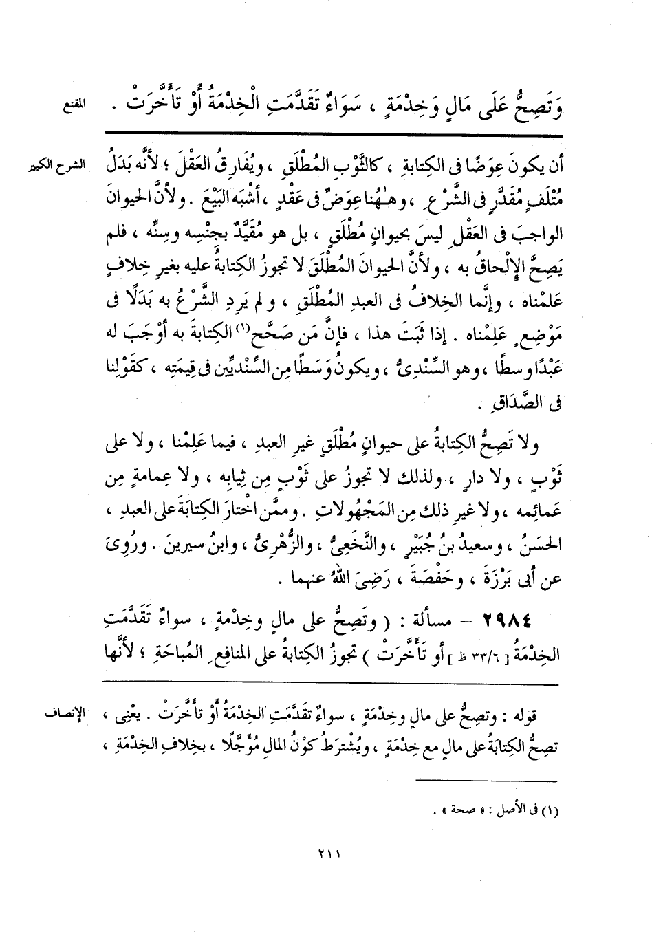 قوله: وتصِحُّ على مالٍ وخِدْمَةٍ، سواءٌ تقَدَّمَتِ الخِدْمَةُ أَوْ تأَخَّرَتْ. يعْنِي، تصِحُّ الكِتابَةُ على مالٍ مع خِدْمَةٍ، ويُشْترَطُ كوْنُ المالِ مُؤَجَّلًا، بخِلافِ الخِدْمَةِ،