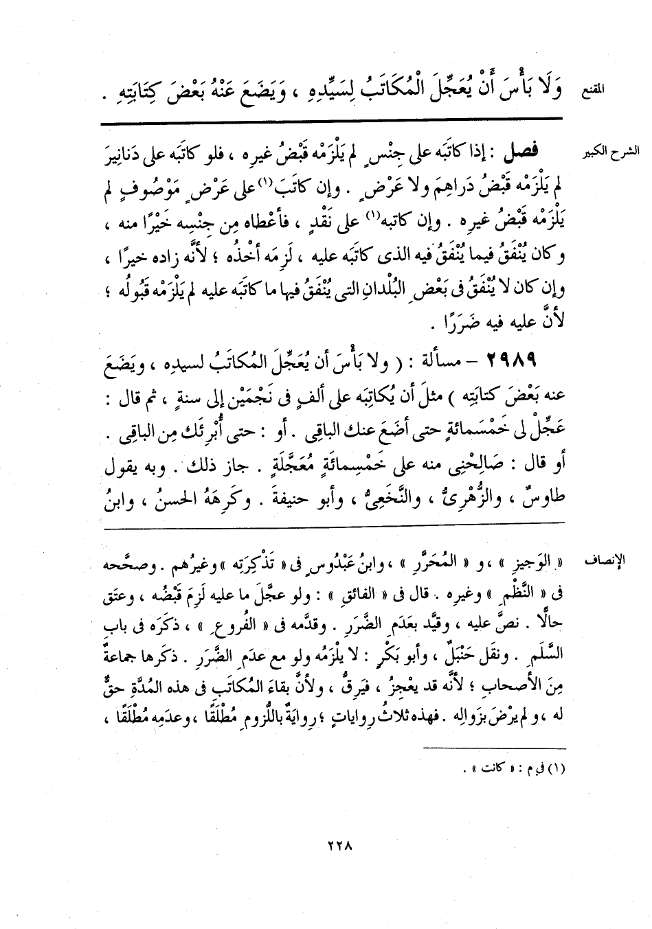 «الوَجيزِ»، و «المُحَرَّرِ»، وابنُ عَبْدُوس في «تَذْكِرَتِه» وغيرُهم. وصحَّحه في «النَّظْمِ» وغيرِه. قال في «الفائقِ»: ولو عجّلَ ما عليه لَزِمَ قَبْضُه، وعتَق حالًّا. نصَّ عليه، وقيَّد بعَدَمِ الضَّرَرِ. وقدَّمه في «الفُروعِ»، ذكَرَه في باب السَّلَمِ. ونقَل حَنْبَلٌ، وأبو بَكْرٍ: لا يلْزَمُه ولو مع عدَمِ الضَّرَرِ. ذكَرها جماعةٌ مِنَ الأصحابِ؛ لأنَّه قد يعْجِزُ، فيَرِقُّ، ولأن بقاءَ المُكاتَب في هذه المُدَّةِ حقٌّ له، ولم يرْضَ بزَوالِه. فهذه ثلاثُ رِواياتٍ؛ رِوايَة باللُّزومِ مُطْلَقًا، وعدَمِه مُطْلَقًا،