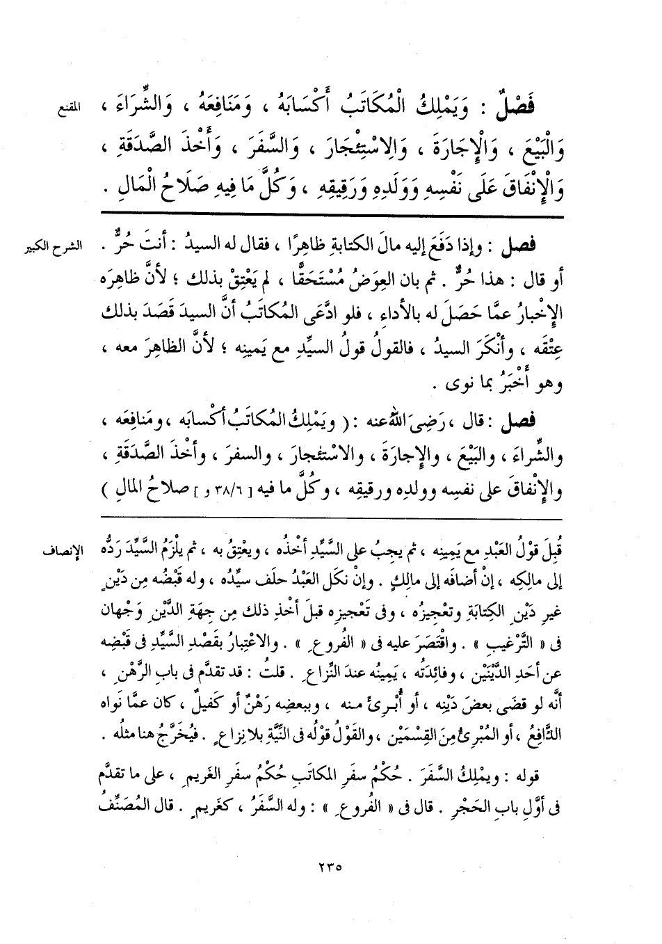 فَصْلٌ: وَيَمْلِكُ الْمُكَاتَبُ أَكْسَابَهُ، وَمَنَافِعَهُ، وَالشِّرَاءَ، وَالْبَيعَ، وَالإِجَارَةَ، وَالاسْتِئْجَارَ، وَالسَّفَرَ، وَأَخْذَ الصَّدَقَةِ، وَالإِنْفَاقَ عَلَى نَفْسِهِ وَوَلَدِهِ وَرَقِيقِهِ، وَكُلَّ مَا فِيهِ صَلَاحُ المَالِ.