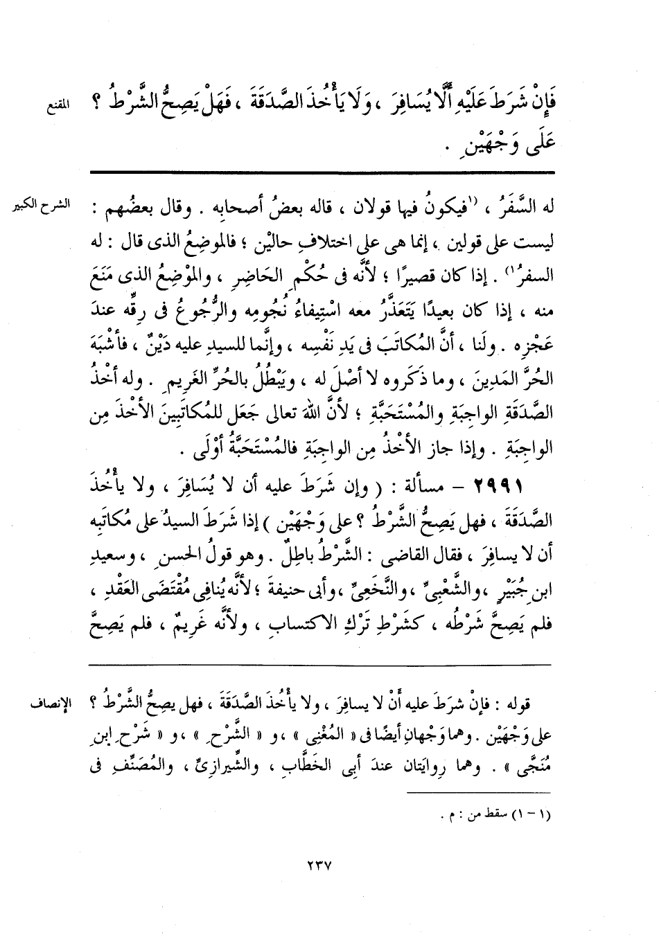 قوله: فإنْ شرَطَ عليه أنْ لا يسافِرَ، ولا يأْخُذَ الصَّدَقَةَ، فهل يصِحُّ الشَّرْطُ؟ على وَجْهَين. وهما وَجْهانِ أيضًا في «المُغْنِي»، و «الشَّرْحِ»، و «شَرْحِ ابنِ مُنَجَّى». وهما رِوايَتان عندَ أبِي الخَطَّابِ، والشِّيرازِيِّ، والمُصَنِّفِ في