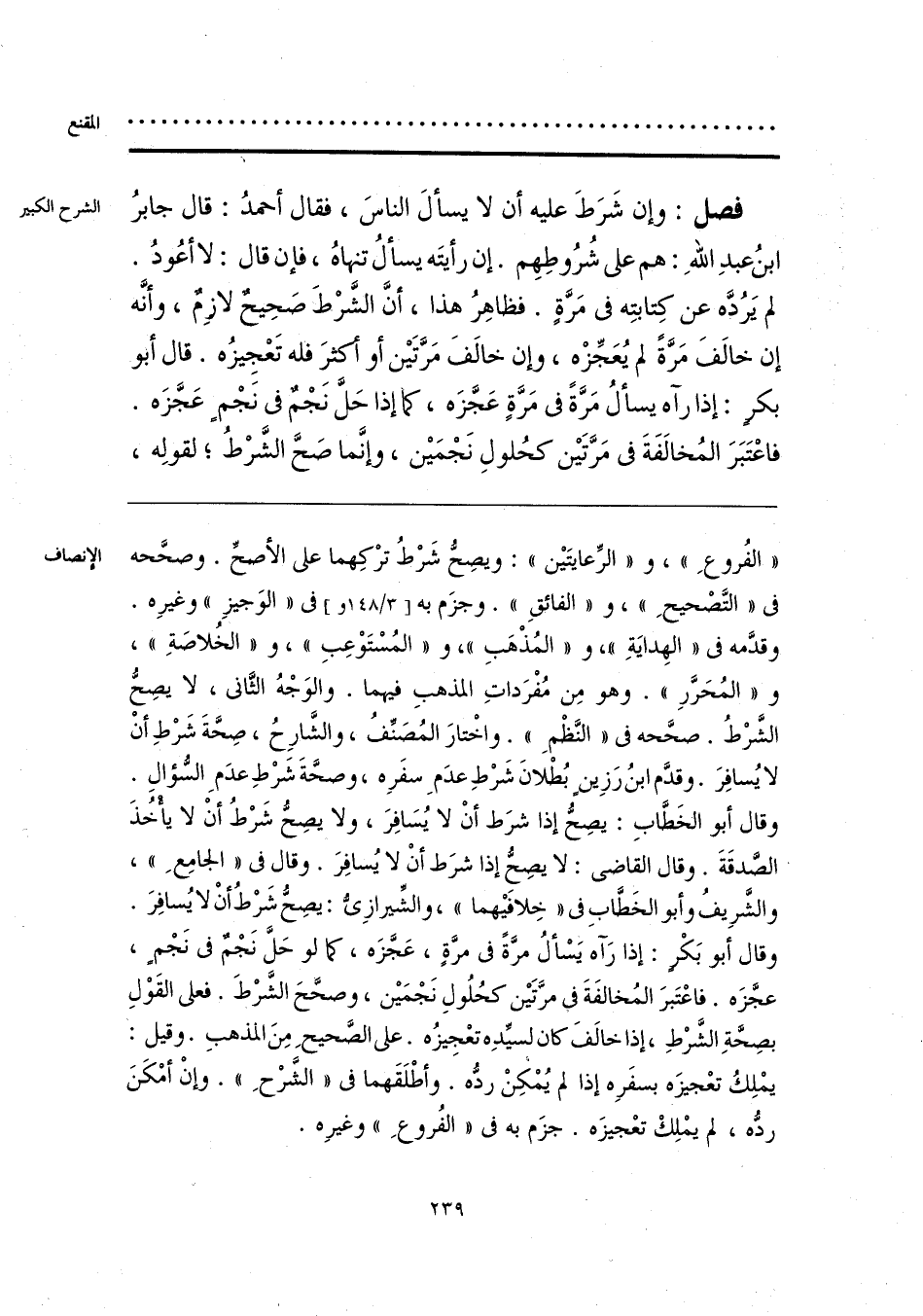 «الفُروعِ»، و «الرِّعايتَين»: ويصِحُّ شَرْطُ ترْكِهما على الأصحِّ. وصحَّحه في «التَّصْحيحِ»، و «الفائقِ». وجزَم به في «الوَجيزِ» وغيرِه. وقدَّمه في «الهِدايَةِ»، و «المُذْهَبِ»، و «المُسْتَوْعِبِ»، و «الخُلاصَةِ»، و «المُحَرَّرِ». وهو مِن مُفْرَداتِ المذهبِ فيهما. والوَجْهُ الثَّاني، لا يصِحُّ الشَّرْطُ. صحَّحه في «النَّظْمِ». واخْتارَ المُصَنِّفُ، والشَّارِحُ، صِحَّةَ شَرْطِ أنْ لا يُسافِرَ. وقدَّم ابنُ رَزِينٍ بُطْلانَ شَرْطِ عدَمِ سفَرِه، وصحَّةَ شَرْطِ عدَمِ السُّؤالِ. وقال أبو الخَطَّابِ: يصِحُّ إذا شرَط أنْ لا يُسَافِرَ، ولا يصِحُّ شَرْطُ أنْ لا يأْخُذَ الصَّدقَةَ. وقال القاضي: لا يصِحُّ إذا شرَط أن لا يُسافِرَ. وقال في «الجامِعِ»، والشَّرِيفُ وأبو الخَطَّابِ في «خِلافَيهما»، والشِّيرازِيُّ: يصِحُّ شَرْطُ أنْ لا يُسافِرَ. وقال أبو بَكْرٍ: إذا رآه يَسْألُ مرَّةً في مرَّةٍ، عَجَّزَه، كما لو حَلَّ نَجْمٌ في نَجْمٍ، عجَّزَه. فاعْتَبرَ المُخالفَةَ في مرَّتَين كحُلُولِ نَجْمَين، وصحًحَ الشَّرْطَ. فعلى القَوْلِ بصِحَّةِ الشَّرْطِ، إذا خالفَ كان لسيِّدِه تعْجِيزُه. على الصَّحيحِ مِنَ المذهبِ. وقيل: يمْلِكُ تعْجيزَه بسفَرِه إذا لم يُمْكِنْ ردُّه. وأطْلَقَهما في «الشَّرْحِ». وإنْ أمْكَنَ ردُّه، لم يمْلِكْ تعْجيزَه. جزَم به في «الفُروعِ» وغيرِه.