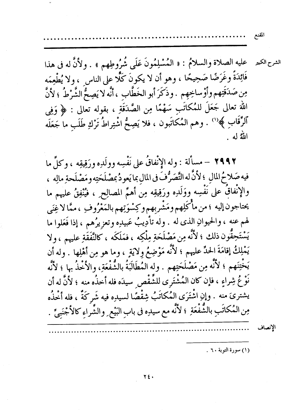 2992 - مسألة: وله الإِنْفاقُ على نَفْسِه وولَدِه ورَقِيقِه، وكلِّ ما فيه صَلاحُ المالِ؛ لأنَّ له التَّصَرُّفَ في المالِ بما يَعودُ بمصْلَحَتِه ومَصْلَحةِ مالِه، والإِنْفاق على نَفْسِه ووَلَدِه ورَقِيقِه مِن أهمِّ المصالِحِ، فيُنْفِقُ عليهم ما يحتاجون إليه؛ من مأكَلِهم ومَشربِهم وكِسْوَتِهم بالمَعْرُوفِ، ممَّا لا غِنَى لهم عنه، والحيوانِ الذي له. وله تأدِيبُ عَبيدِه وتعزِيرُهم، إذا فَعَلوا ما يَسْتَحِقُّون ذلك؛ لأنَّه مِن مَصْلَحَةِ مِلْكِه، فمَلَكَه، كالنَّفَقَةِ عليهم، ولا يَمْلِكُ إقامَةَ الحدِّ عليهم؛ لأنَّه مَوْضِعُ ولايَةٍ، وما هو مِن أهْلِها. وله أن يَخْتِنَهم؛ لأنَّه مِن مَصْلَحَتِهم. وله المُطَالبَةُ بالشُّفْعَةِ، والأخْذُ بها؛ لأنَّه نَوْعُ شِراءٍ، فإن كان المُشْتَرِي للشِّقْصِ سيدَه فله أخذُه منه؛ لأنَّ له أن يشتريَ منه. وإنِ اشْتَرَى المُكاتَبُ شِقْصًا لسيدِه فيه شَرِكَةٌ، فله أخْذُه مِن المُكاتَبِ بالشُّفْعَةِ؛ لأنَّه مع سيدِه في بابِ البَيعِ والشِّراءِ كالأجْنَبِيِّ.