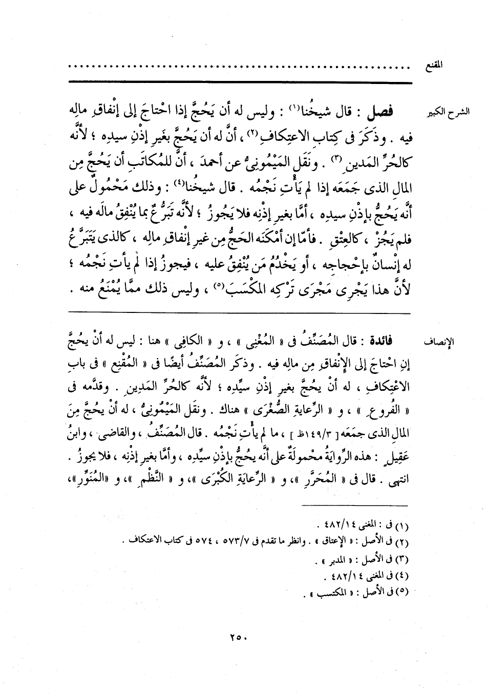 فائدة: قال المُصَنِّفُ في «المُغْنِي»، و «الكافِي» هنا: ليس له أنْ يحُجَّ إنِ احْتاجَ إلى الانْفاقِ مِن مالِه فيه. وذكَر المُصَنِّفُ أيضًا في «المُقْنِع» في بابِ الاعْتِكافِ، له أنْ يحُجَّ بغيرِ إذْنِ سيِّدِه، لأنَّه كالحُرِّ المَدِينِ. وقدَّمه في «الفُروعِ»، و «الرِّعايةِ الصُّغْرَى» هناك. ونقَل المَيمونِيُّ، له أنْ يحُجَّ مِنَ المالِ الذي جمَعَه، ما لم يأْتِ نَجْمُه. قال المُصَنِّفُ، والقاضي، وابنُ عَقِيلٍ: هذه الرِّوايَةُ محْمولَةٌ على أنَّه يحُجُّ بإذْنِ سيِّدِه، وأمَّا بغيرِ إذْنِه، فلا يجوزُ. انتهى. قال في «المُحَرَّرِ»، و «الرِّعايَةِ الكُبْرَى»، و «النَّظْمِ»، و «المُنَوِّرِ»،