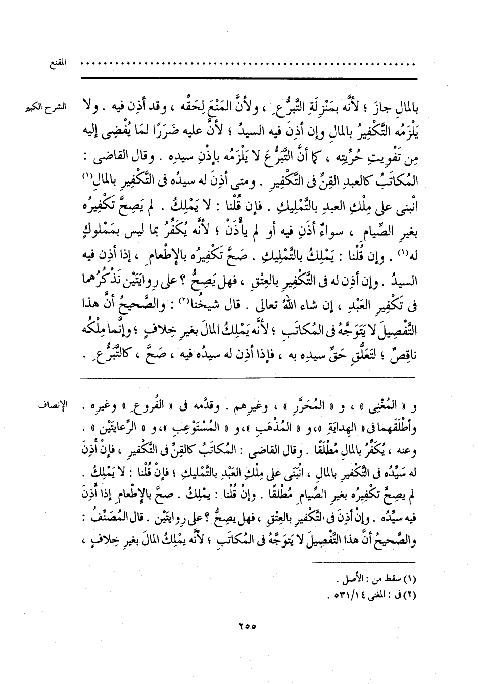 و «المُغْنِي»، و «المُحَرَّرِ»، وغيرِهم. وقدَّمه في «الفُروعِ» وغيرِه. وأطْلَقَهما في «الهِدايَةِ»، و «المُذْهَبِ»، و «المُسْتَوْعِبِ»، و «الرِّعايتَين». وعنه، يُكَفِّرُ بالمالِ مُطْلَقًا. وقال القاضي: المُكاتَبُ كالقِنِّ في التَّكْفيرِ، فإنْ أَذِنَ له سَيِّدُه في التَّكْفيرِ بالمالِ، انْبَنَى على مِلْكِ العَبْدِ بالتَّمْليكِ؛ فإنْ قُلْنا: لا يَمْلِكُ. لم يصِح تكْفِيره بغيرِ الصِّيامِ مُطْلقًا. وإنْ قُلْنا: يمْلِكُ. صحَّ بالإطْعامِ إذا أَذِنَ فيه سيِّدُه. وإن أذِنَ في التَّكْفيرِ بالعِتْقِ، فهل يصِحُّ؟ علي رِوايتَين. قال المُصَنِّفُ: والصَّحيحُ أن هذا التَّفْصِيلَ لا يَتوَجَّهُ في المُكاتَبِ؛ لأنَّه يمْلِكُ المال بغيرِ خِلافٍ،