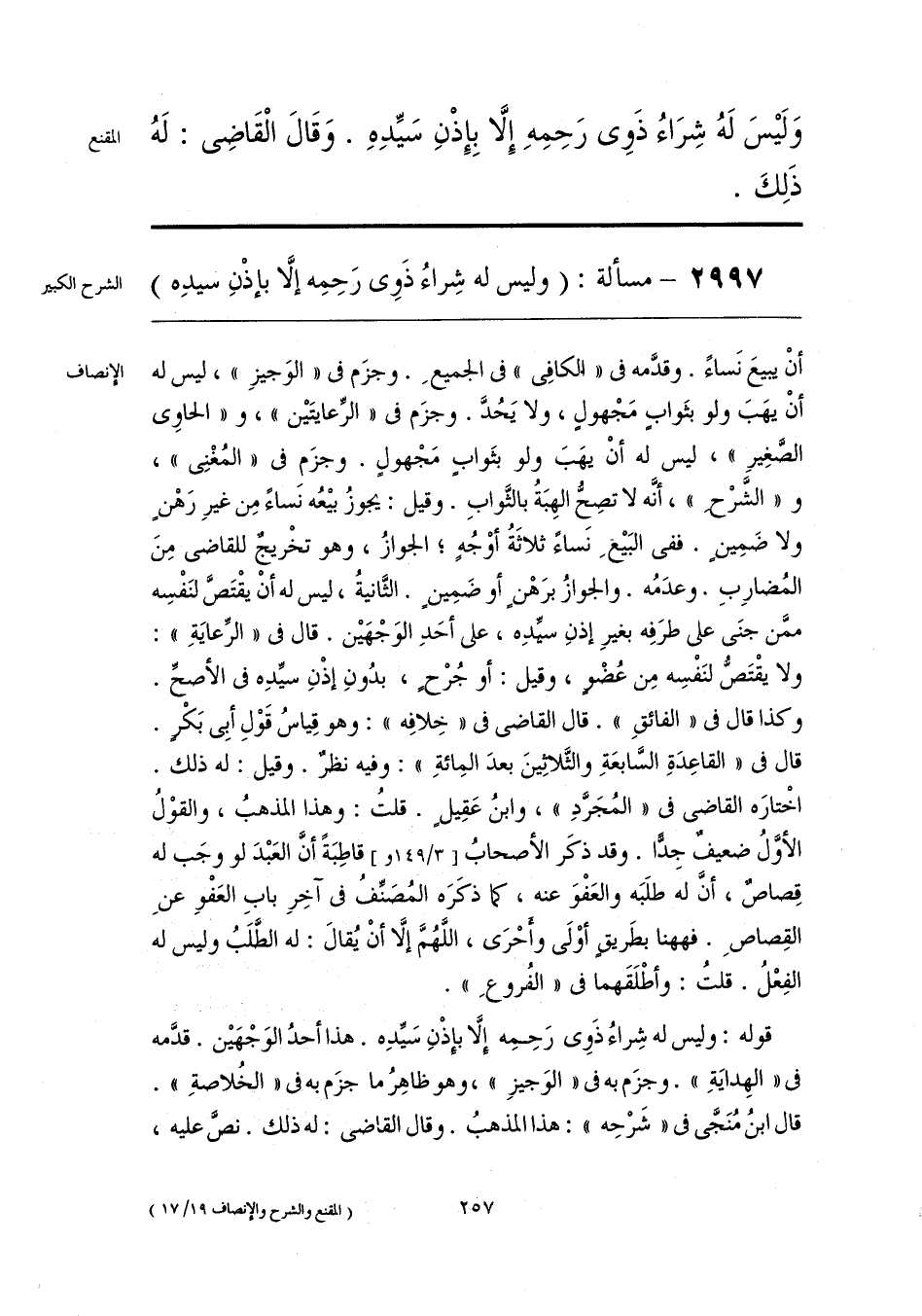 قوله: وليس له شِراءُ ذَوي رَحِمِه إلَّا بإذْنِ سَيِّدِه. هذا أحدُ الوَجْهَين قدَّمه في «الهِدايَةِ». وجزَم به في «الوَجيزِ»، وهو ظاهِرُ ما جزَم به في «الخُلاصةِ». قال ابنُ مُنَجَّى في «شَرْحِه»: هذا المذهبُ. وقال القاضي: له ذلك. نصَّ عليه،
