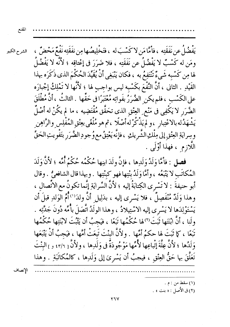 يَفْضُلُ عن نَفَقَتِه، فأمَّا مَن لا كَسْبَ له، فتَخْلِيصُها مِن نفَقَتِه نَفْعٌ مَحْضٌ، ومَن له كَسْبٌ لا يَفْضُلُ عن نَفَقَتِه، فلا ضَرَرَ في إعْتاقِه؛ لأنَّه لا يَفْضُلُ لها مِن كَسْبِه شَيءٌ تَنْتَفِعُ به، فكان يَنْبَغِي أنْ يُقَيِّدَ الحُكْمَ الذي ذَكَرَه بهذا القَيدِ. الثاني، أنَّ النَّفْعَ بكَسْبِة ليس بواجِبٍ لها؛ لأنَّها لا تَمْلِكُ إجْبارَه على الكَسْبِ، فلم يكنِ الضَّرَرُ بفَواتِه مُعْتَبَرًا في حَقِّها. الثالثُ، أنَّ مُطْلَقَ الضَّرَرِ لا يَكْفِي في مَنْعِ العِتْقِ الذي تحَقَّق مُقتَضِيه، ما لم يكُنْ له أصْلٌ يَشْهَدُ له بالاعْتِبارِ، ولم يَذْكُرْ له أصْلًا، ثم هو مُلْغًى بعِتْقِ المُفْلِسِ والرَّاهِنِ وسِرايَةِ العِتْقِ إلى مِلْكِ الشَّرِيكِ، فإنَّه يَعْتِقُ مع وُجودِ الضَّرَرِ بتَفْويتِ الحَقِّ اللَّازِمَ، فهذا أوْلَى.