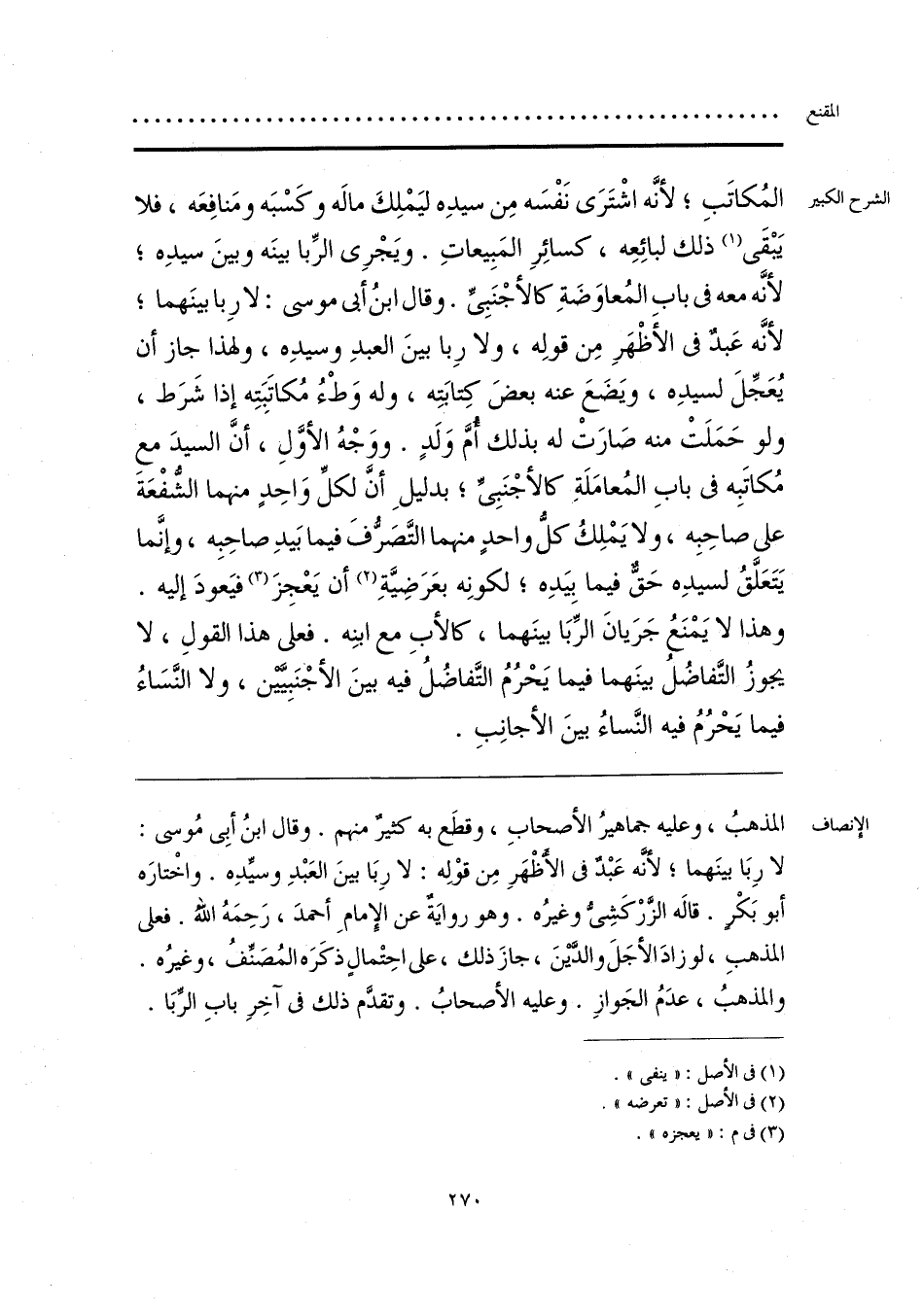 المذهبُ، وعليه جماهيرُ الأصحابِ، وقطَع به كثيرٌ منهم. وقال ابنُ أبِي مُوسى: لا رِبَا بينَهما؛ لأنَّه عَبْدٌ في الأظْهَرِ مِن قوْلِه: لا رِبَا بينَ العَبْدِ وسيِّدِه. واخْتارَه أبو بَكْرٍ. قاله الزَّرْكَشِيُّ وغيرُه. وهو روايَةٌ عن الإِمامِ أحمدَ، رَحِمَهُ الله. فعلى المذهبِ، لو زادَ الأجَلَ والدَّينَ، جازَ ذلك، على احِتْمالٍ ذكَرَه المصَنِّفُ، وغيرُه. والمذهبُ، عدَمُ الجَوازِ. وعليه الأصحابُ. وتقدَّم ذلك في آخِرِ بابِ الرِّبَا.