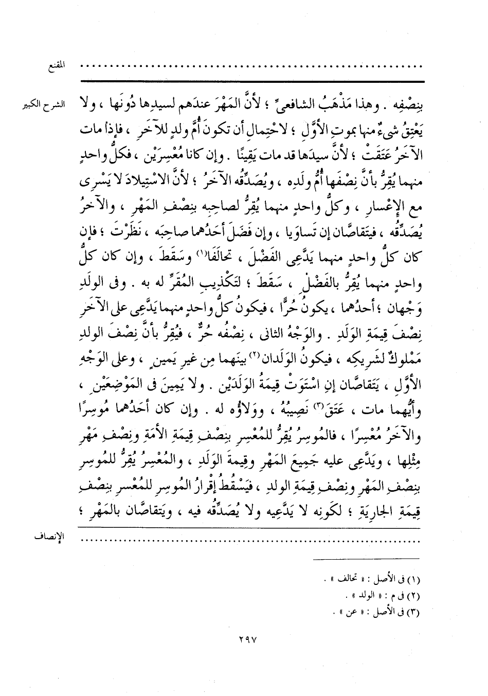 بنِصْفِه. وهذا مَذْهَبُ الشافعيِّ؛ لأنَّ المَهْرَ عندَهم لسيدِها دُونَها، ولا يَعْتِقُ شيءٌ منها بموتِ الأوَّلِ، لاحْتِمالِ أن تكونَ أُمَّ ولدٍ للآخَرِ، فإذا مات الآخَرُ عَتَقَتْ، لأنَّ سيدَها قد مات يَقِينًا. وإن كانا مُعْسِرَين، فكلُّ واحدٍ منهما يُقِرُّ بأنَّ نِصْفَها أُمُّ ولَدِه، ويُصَدِّقُه الآخَرُ؛ لأنَّ الاسْتِيلادَ لا يَسْرِي مع الإِعْسارِ، وكلُّ واحدٍ منهما يُقِرُّ لصاحِبِه بنِصْفِ المَهْرِ، والآخرُ يُصَدِّقُه، فيتَقاصَّان إن تَساوَيا، وإن فَضَلَ أحَدُهما صاحِبَه، نَظَرْتَ؛ فإن كان كلُّ واحدٍ منهما يَدَّعِي الفَضْلَ، تحالفَا (¬1) وسَقَطَ، وإن كان كلُّ واحدٍ منهما يُقِرُّ بالفَضْلِ، سَقَطَ؛ لتَكْذِيبِ المُقَرِّ له به. وفي الولَدِ وَجْهان؛ أحدُهما، يكونُ حُرًّا، فيكونُ كلُّ واحدٍ منهما يَدَّعِي على الآخرِ نِصْفَ قِيمَةِ الوَلَدِ. والوَجْهُ الثاني، نِصْفُه حُرٌّ، فيُقِرُّ بأنَّ نِصْفَ الولدِ مَمْلوكٌ لشَرِيكِه، فيكونُ الوَلَدان (¬2) بينَهما مِن غيرِ يَمينٍ، وعلى الوَجْهِ الأوَّلِ، يَتَقاصَّان إنِ اسْتَوَتْ قِيمَةُ الوَلَدَين. ولا يَمِينَ في المَوْضِعَينِ، وأيُّهما مات، عَتَقَ (¬3) نَصِيبُهُ، ووَلاوه له. وإن كان أحَدُهما مُوسِرًا والآخَرُ مُعْسِرًا، فالمُوسِرُ يُقِرُّ للمُعْسِرِ بنِصْفِ قِيمَةِ الأمَةِ ونِصْفِ مَهْرِ مِثْلِها، ويَدَّعِي عليه جَمِيعَ المَهْرِ وقِيمةَ الوَلَدِ، والمُعْسِرُ يُقِرُّ للمُوسِرِ بنِصْفِ المَهْرِ ونِصْفِ قِيمَةِ الولدِ، فيَسْقُطُ إقْرارُ المُوسِرِ للمُعْسرِ بنِصْفِ قِيمَةِ الجارِيَةِ؛ لكَونِه لا يَدَّعِيه ولا يُصَدِّقُه فيه، ويَتقاصَّان بالمَهْرِ،