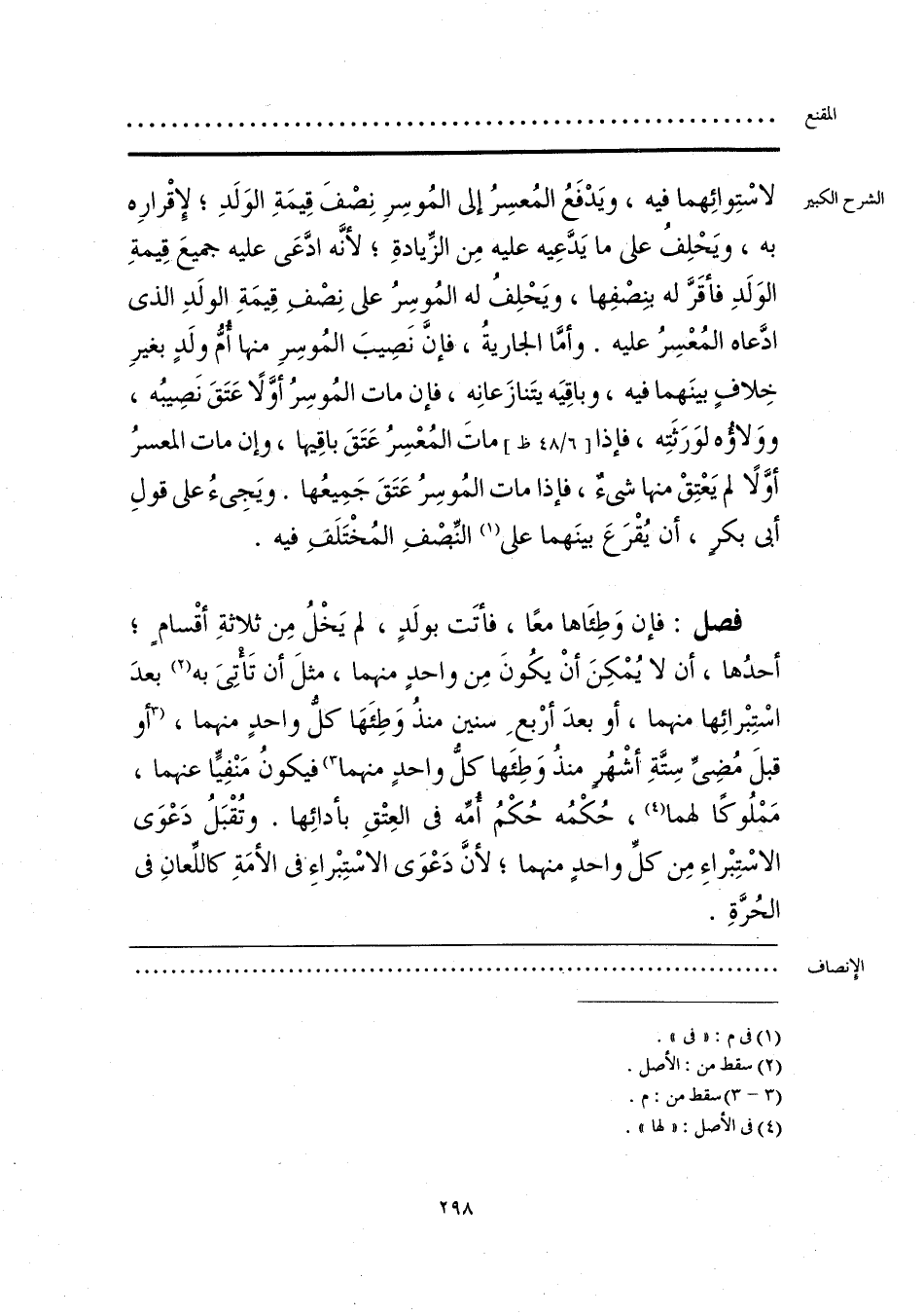 لاسْتِوائِهما فيه، ويَدْفَعُ المُعسِرُ إلى المُوسِرِ نِصْفَ قِيمَةِ الوَلَدِ؛ لإِقْرارِه به، ويَحْلِفُ على ما يَدَّعِيه عليه مِن الزِّيادةِ؛ لأنَّه ادَّعَى عليه جميعَ قِيمةِ الوَلَدِ فأقَرَّ له بنِصْفِها، ويَحْلِفُ له المُوسِرُ على نِصْفِ قِيمَةِ الولَدِ الذي ادَّعاه المُعْسِرُ عليه. وأمَّا الجاريةُ، فإنَّ نَصِيبَ المُوسِرِ منها أُمُّ ولَدٍ بغيرِ خِلافٍ بينَهما فيه، وباقِيَه يتَنازَعانِه، فإن مات المُوسِرُ أوَّلًا عَتَقَ نَصِيبُه، ووَلاؤُه لوَرَثَتِه، فإذا ماتَ المُعْسِرُ عَتَقَ باقِيها، وإن مات المعسرُ أوَّلًا لم يَعْتِقْ منها شيء، فإذا مات المُوسِرُ عَتَقَ جَمِيعُها. ويَجِئُ على قولِ أبي بكر، أن يُقْرَعَ بينَهما على (¬1) النِّصْفِ المُخْتَلَفِ فيه.