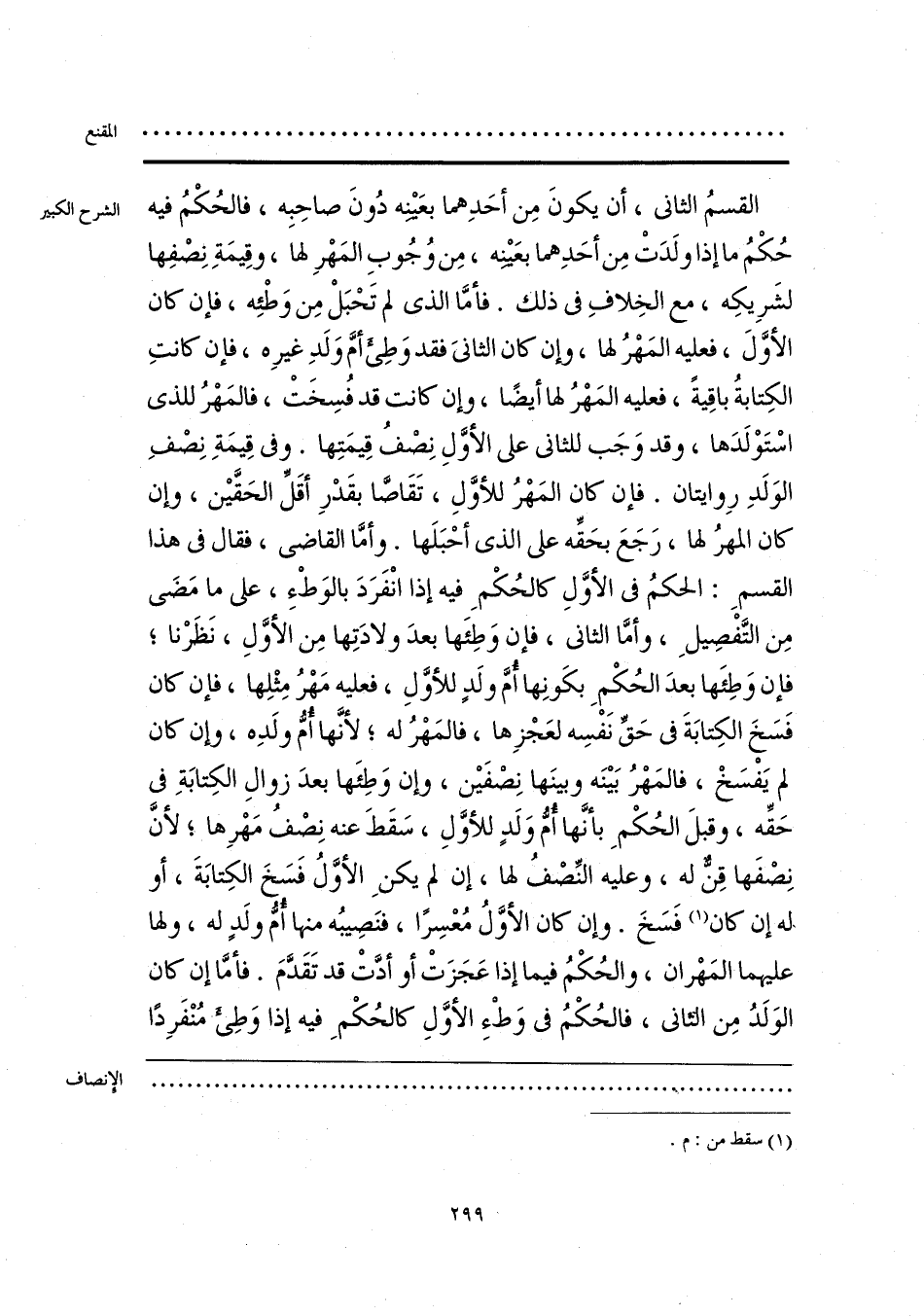 القسمُ الثاني، أن يكونَ مِن أحَدِهما بعَينِه دُونَ صاحِبِه، فالحُكْمُ فيه حُكْمُ ما إذا ولَدَتْ مِن أحَدِهما بعَينِه، مِن وُجُوبِ المَهْرِ لها، وقِيمَةِ نِصْفِها لشَرِيكِه، مع الخِلافِ في ذلك. فأمَّا الذي لم تَحْبَلْ مِن وَطْئِه، فإن كان الأوَّلَ، فعليه المَهْرُ لها، وإن كان الثانىَ فقد وَطِيء أمَّ وَلَدِ غيرِه، فإن كانتِ الكِتابةُ باقِيةً، فعليه المَهْرُ لها أيضًا، وإن كانت قد فُسِخَتْ، فالمَهْرُ للذي اسْتَوْلَدَها، وقد وَجَب للثاني على الأوَّلِ نِصْفُ قِيمَتِها. وفي قِيمَةِ نِصْفِ الوَلَدِ رِوايتان. فإن كان المَهْرُ للأوَّلِ، تَقَاصَّا بقَدْرِ أقَلِّ الحَقَّين، وإن كان المهرُ لها، رَجَعَ بحَقِّه على الذي أحْبَلَها. وأمَّا القاضي، فقال في هذا القسمِ: الحكمُ في الأوَّلِ كالحُكْمِ فيه إذا انْفَرَدَ بالوَطْءِ، على ما مَضَى مِن التَّفْصِيلِ، وأمَّا الثاني، فإن وَطِئَها بعدَ ولادَتِها مِن الأوَّلِ، نَظَرْنا؛ فإن وَطِئَها بعدَ الحُكمِ بكَونِها أُمَّ ولَدٍ للأوَّلِ، فعليه مَهْرُ مِثْلِها، فإن كان فَسَخَ الكِتابَةَ في حَقِّ نفْسِه لعَجْزِها، فالمَهْرُ له؛ لأنَّها أُمُّ ولَدِه، وإن كان لم يَفسَخْ، فالمَهْرُ بَينَه وبينَها نِصْفَين، وإن وَطِئَها بعدَ زوالِ الكِتابَةِ في حَقه، وقبلَ الحُكْمِ بأنَّها أم وَلَدٍ للأوَّلِ، سَقَطَ عنه نِصْفُ مَهْرِها؛ لأنَّ نِصْفَها قِنٌّ له، وعليه النِّصْفُ لها، إن لم يكنِ الأوَّلُ فَسَخَ الكِتابَةَ، أو له إن كان (¬1) فَسَخَ. وإن كان الأوَّلُ مُعْسِرًا، فنَصِيبُه منها أُمُّ ولَدٍ له، ولها عليهما المَهْران، والحُكْمُ فيما إذا عَجَزَتْ أو أدَّتْ قد تَقَدَّمَ. فأمَّا إن كان الوَلَدُ مِن الثاني، فالحُكْمُ في وَطْءِ الأوَّلِ كالحُكْمِ فيه إذا وَطِئ مُنْفَرِدًا