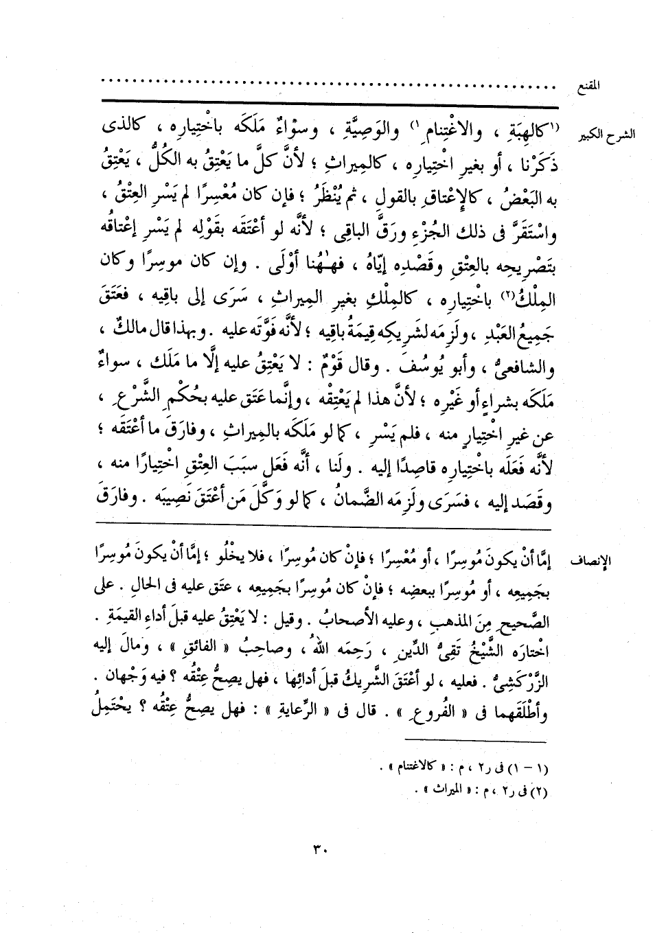 إمّا أنْ يكونَ مُوسِرًا، أو مُعْسِرًا؛ فإنْ كان مُوسِرًا، فلا يخْلُو؛ إمَّا أنْ يكونَ مُوسِرًا بجَمِيعِه، أو مُوسِرًا ببعضِه؛ فإنْ كان مُوسِرًا بجَمِيعِه، عتَق عليه في الحالِ. على الصَّحيح مِنَ المذهبِ، وعليه الأصحابُ. وقيل: لا يَعْتِقُ عليه قبلَ أداءِ القيمَةِ. اخْتارَه الشَّيخُ تَقِيُّ الدِّينِ، رَحِمَه اللهُ، وصاحِبُ «الفائقِ»، ومال إليه الزَّرْكَشِيُّ. فعليه، لو أعْتَقَ الشرِيكُ قبلَ أدائِها، فهل يصِح عِتْقُه؛ فيه وَجْهان. وأطْلَقَهما في «الفُروعِ». قال في «الرِّعايةِ»: فهل يصِح عِتْقُه؟ يحْتَمِلُ