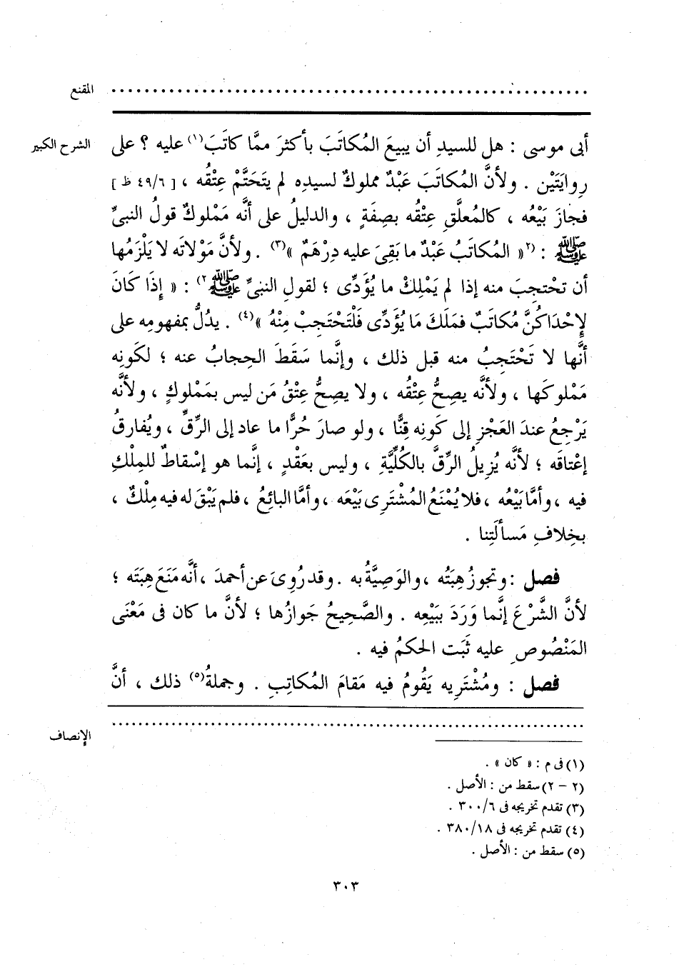 أبي موسى: هل للسيدِ أن يبيعَ المُكاتَبَ بأكثرَ ممَّا كاتَبَ (¬1) عليه؟ على رِوايَتَين. ولأنَّ المُكاتَبَ عَبْدٌ مملوكٌ لسيدِه لم يتَحَتَّمْ عِتْقُه، فجازَ بَيعُه، كالمُعلَّقِ عِتْقُه بصِفَةٍ، والدليلُ على أنَّه مَمْلوكٌ قولُ النبيِّ - صلى الله عليه وسلم -: [«المُكاتَبُ عَبْدٌ ما بَقِيَ عليه دِرْهَمٌ» (¬2). ولأنَّ مَوْلاتَه لا يَلْزَمُها أن تحْتجِبَ منه إذا لم يَمْلِك ما يُؤَدِّي؛ لقولِ النبيِّ - صلى الله عليه وسلم -] (¬3): «إِذَا كَانَ لإحْدَاكُنَّ مُكاتَبٌ فمَلَكَ مَا يُؤَدِّي فَلْتَحْتَجِبْ مِنْهُ» (¬4). يدُلّ بمفهومِه على أنَّها لا تَحْتَجِبُ منه قبل ذلك، وإنَّما سَقَطَ الحِجابُ عنه؛ لكَونِه مَمْلوكَها, ولأنَّه يصِحُّ عِتْقُه، ولا يصِحُّ عِتْقُ مَن ليس بمَمْلوكٍ، ولأنَّه يَرْجِعُ عندَ العَجْزِ إلى كَونِه قِنًّا, ولو صارَ حُرًّا ما عاد إلى الرِّقِّ، ويُفارقُ إعْتاقَه؛ لأنَّه يُزِيلُ الرِّقَّ بالكُليَّةِ، وليس بعَقْدٍ، إنَّما هو إسْقاطٌ للمِلْكِ فيه، وأمَّا بَيعُه، فلا يُمْنَعُ المُشْتَرِي بَيعَه، وأمَّا البائِعُ، فلم يَبْقَ له فيه مِلْكٌ، بخِلافِ مَسألَتِنا.