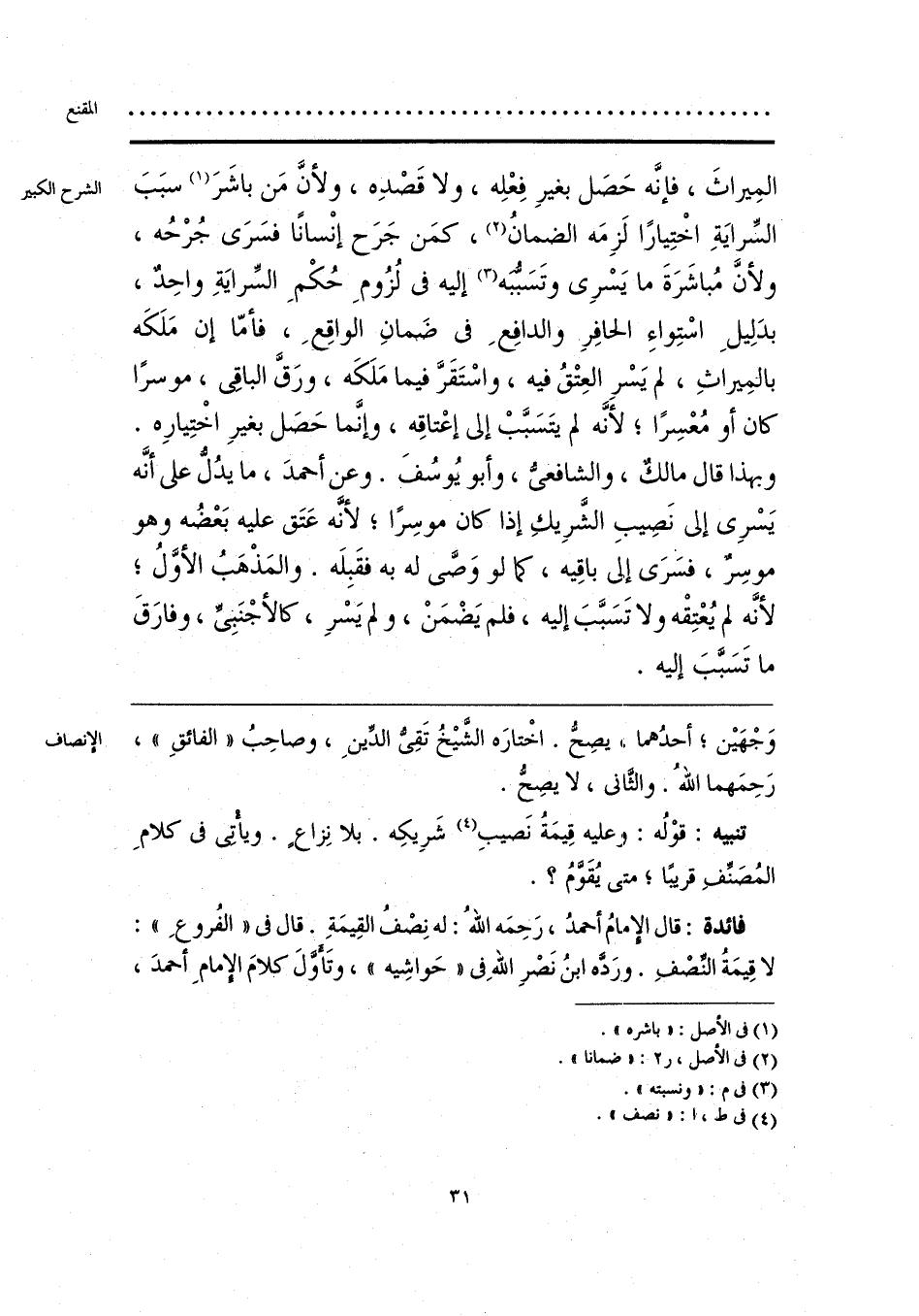 فائدة: قال الإمامُ أحمدُ، رَحِمَه اللهُ: له نِصْفُ القِيمَةِ. قال في «الفُروعِ»: لا قِيمَةُ النصْفِ. ورَدَّه ابنُ نَصْرِ اللهِ في «حَواشِيه»، وتَأَوَّلَ كلامَ الإمامِ أحمدَ،