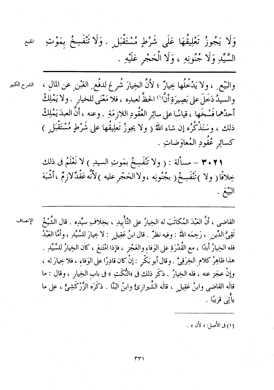وَلَا يَجُوزُ تَعْلِيقُهَا عَلَى شَرْطٍ مُسْتَقبَلٍ. وَلَا تَنْفَسِخُ بِمَوْتِ السَّيِّدِ وَلَا جُنُونِهِ، وَلَا الْحَجْرِ عَلَيهِ.