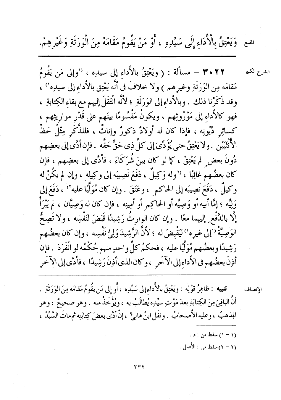 تنبيه: ظاهِرُ قوْلِه: ويَعْتِقُ بالأداءِ إلى سَيِّدِه، أو إِلى مَن يقُومُ مَقامَه مِنَ الوَرَثَةِ. أنَّ الباقِيَ مِنَ الكِتابَةِ بعدَ مَوْتِ سيِّدِه يُطالبُ به، ويُؤخَذُ منه. وهو صحيحٌ، وهو المذهبُ، وعليه الأصحابُ. ونقَل ابنُ هانِئٍ، إنْ أدَّى بعضَ كِتابَتِه ثم ماتَ السَّيِّدُ،