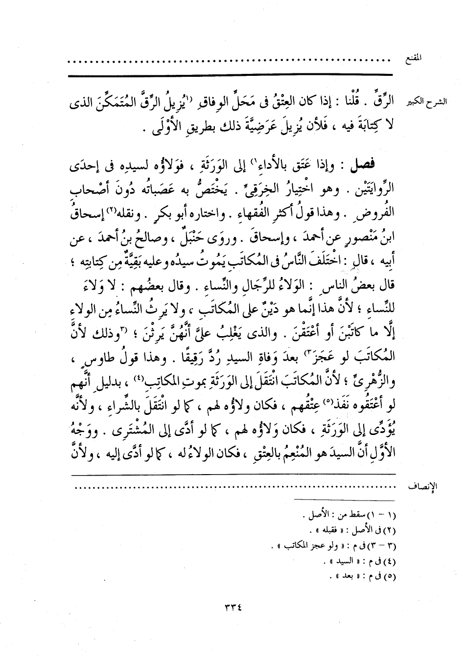 فصل: وإذا عَتَق بالأداءِ] (¬1) إلى الوَرَثَةِ، فوَلاؤُه لسيدِه في إحدَى الرِّوايَتَين. وهو اخْتِيارُ الخِرَقِيِّ. يَختَصُّ به عَصَباتُه دُونَ أصْحابِ الفُروضِ. وهذا قولُ أكثرِ الفُقهاءِ. واختاره أبو بكر. ونقله (¬2) إسحاقُ بنُ مَنْصورٍ عن أحمدَ، وإسحاقَ. وروَى حَنْبَل، وصالحُ بن أحمدَ، عن أبِيه، يأتي: اخْتَلَفَ النَّاسُ في المُكاتَبِ يَمُوتُ سيدُه وعليه بَقِيَّة مِن كِتابتِه؛ قال بعضُ الناسِ: الوَلاءُ للرِّجَالِ والنِّساءِ. وقال بعضُهم: لا وَلاءَ للنِّساءِ؛ لأنَّ هذا إنَّما هو دَينٌ على المُكاتَبِ، ولا يَرِثُ النِّساءُ من الولاء إلَّا ما كاتَبْنَ أو أعْتَقْنَ. والذي يَغْلِبُ عليَّ أنَّهُنَّ يَرِثْنَ؛ [وذلك لأنَّ المُكاتَبَ لو عَجَزَ] (¬3) بعدَ وَفاةِ السيدِ رُدَّ رَقِيقًا. وهذا قولُ طاوس، والزُّهْرِيِّ؛ لأنَّ المُكاتَبَ انْتَقَلَ إلى الوَرَثَةِ بموتِ المكاتِبِ (¬4)، بدليلِ أنَّهم لو أعْتَقُوه نَفَذ (¬5) عِتْقُهم، فكان ولاؤه لهم، كما لو انْتَقَلَ بالشِّراءِ، ولأنَّه يُؤَدِّي إلى الوَرَثَةِ، فكان وَلاؤه لهم، كما لو أدَّى إلى المُشْتَرِي. ووَجْهُ الأوَّلِ أنَّ السيدَ هو المُنْعِمُ بالعِتْقِ، فكان الولاءُ له، كما لو أدَّى إليه، ولأنَّ