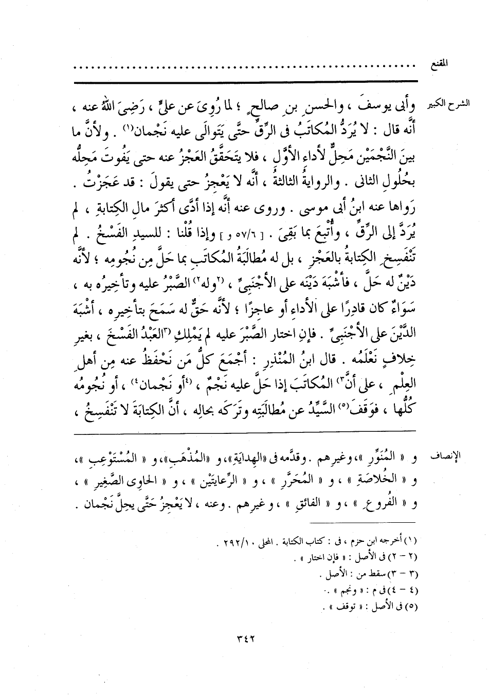 و «المُنَورِ»، وغيرِهم. وقدَّمه في «الهِدايَةِ»، و «المُذْهَبِ»، و «المُسْتَوْعِبِ»، و «الخُلاصَةِ»، و «المُحَرَّرِ»، و «الرِّعايتَين»، و «الحاوي الصَّغِيرِ»، و «الفُروعِ»، و «الفائقِ»، وغيرِهم. وعنه، لا يَعْجِزُ حَتَّى يحِل نَجْمان.