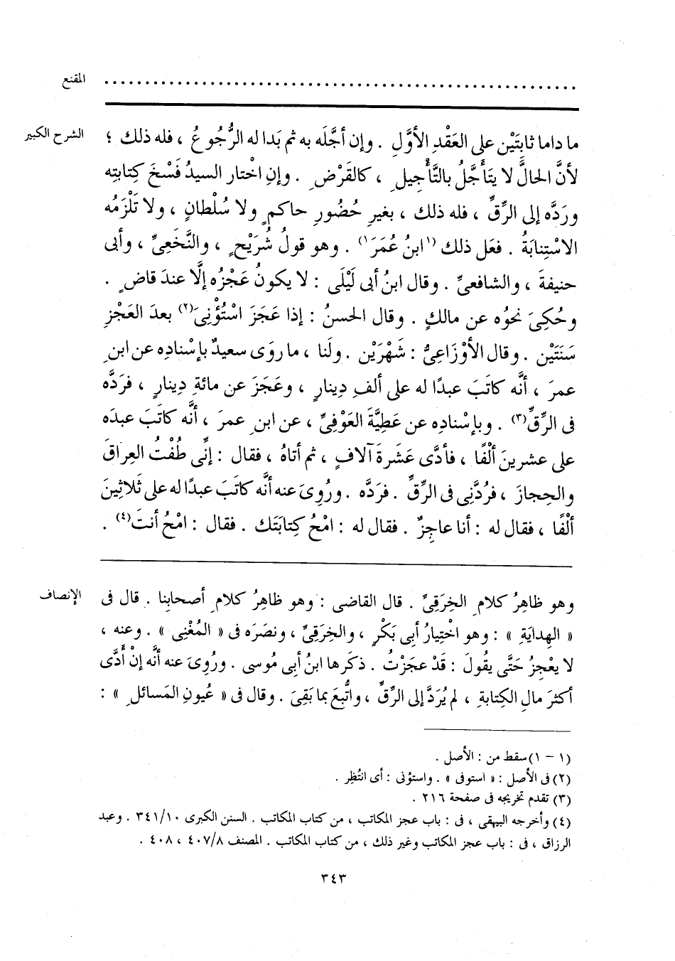 وهو ظاهِرُ كلامِ الخِرَقِيِّ. قال القاضي: وهو ظاهِرُ كلامِ أصحابِنا. قال في «الهِدايَةِ»: وهو اخْتِيارُ أبِي بَكْر، والخِرَقِيِّ، ونصَرَه في «المُغْنِي». وعنه، لا يعْجِزُ حَتَّى يقُولَ: قَدْ عجَزْتُ. ذكَرها ابنُ أبِي مُوسى. ورُوِيَ عنه أنَّه إنْ أدَّى أكثرَ مالِ الكِتابةِ، لم يُرَدَّ إلى الرِّق، واتُّبعَ بما بَقِيَ. وقال في «عُيونِ المَسائلِ»: