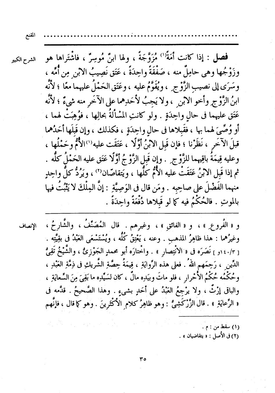 و «الفُروعِ»، و «الفائقِ»، وغيرِهم. قال المُصَنِّفُ، والشَّارِحُ، وغيرُهما: هذا ظاهِرُ المذهبِ. وعنه، يَعْتِقُ كُله، ويُسْتَسْعَى العَبْدُ في بقِيَّته. نَصَرَه في «الانْتِصارِ». واخْتارَه أبو محمدٍ الجَوْزِيُّ، والشَّيخُ تَقِيُّ الدِّينِ، رَحِمَهم اللهُ. فعلى هذه الرِّوايَةِ، قِيمَةُ حِصَّةِ الشريكِ في ذِمةِ العَبْدِ، وحُكْمُه حُكْمُ الأحْرارِ، فلو ماتَ وبيَدِه مالٌ، كان لسَيِّدِه ما بَقِيَ مِنَ السِّعايَةِ، والباقي إرْث، ولا يرْجِعُ العَبْدُ على أحَدٍ بشيءٍ. وهذا الصَّحيحُ. قدَّمه في «الرِّعايَةِ». قال الزَّرْكَشِيُّ: وهو ظاهِرُ كلامِ الأكْثَرِينَ. وهو كما قال، فإنَّهم