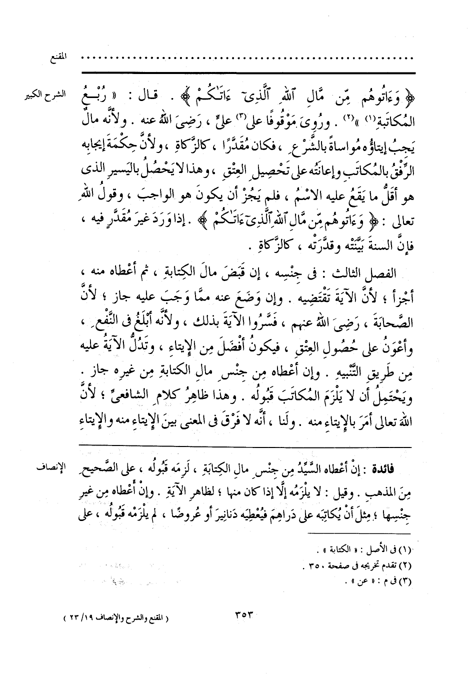 فائدة: إنْ أعْطاه السيدُ مِن جِنْسِ مالِ الكِتابَةِ، لَزِمَه قَبُولُه، على الصحيح مِنَ المذهبِ. وقيل: لا يلْزَمُه إلا إذا كان منها؛ لظاهرِ الآيَةِ. وإنْ أعطاه مِن غيرِ جِنْسِها؛ مِثلَ أنْ يكاتِبَه على دَراهِمَ فيُعْطِيَه دَنانِيرَ أو عُروضًا، لم يلْزَمْه قَبُولُه، على