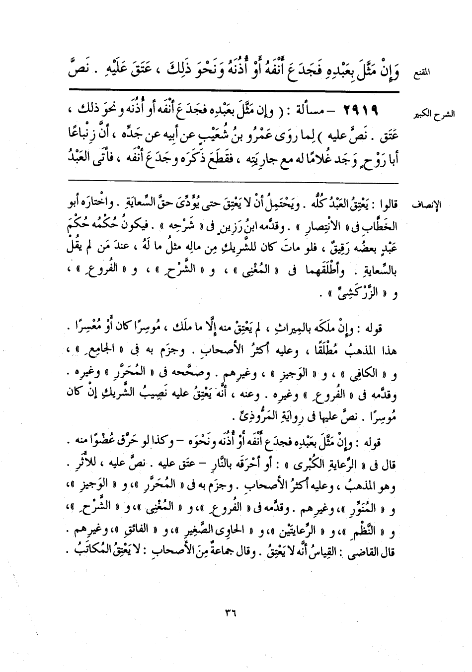 قوله: وإِنْ مَثَّلَ بعَبْدِه فجدَع أَنْفَه أوْ أُذُنَه ونَحْوَه -وكذا لو حَرَّق عُضْوًا منه. قال في «الرِّعايةِ الكُبْرى»: أو أحْرَقَه بالنَّارِ- عتَق عليه. نصَّ عليه، للأَثَرِ. وهو المذهبُ، وعليه أكثرُ الأصحابِ. وجزَم به في «المُحَررِ»، و «الوَجيزِ»، و «المُنَوِّرِ»، وغيرِهم. وقدَّمه في «الفُروعِ»، و «المُغْنِي»، و «الشَّرْحِ»، و «النَّظْمِ»، و «الرِّعايتَين»، و «الحاوي الصغِيرِ»، و «الفائقِ»، وغيرِهم. قال القاضي: القِياسُ أنه لا يَعْتِقُ. وقال جماعةٌ مِنَ الأصحابِ: لا يَعْتِقُ المُكاتَبُ.